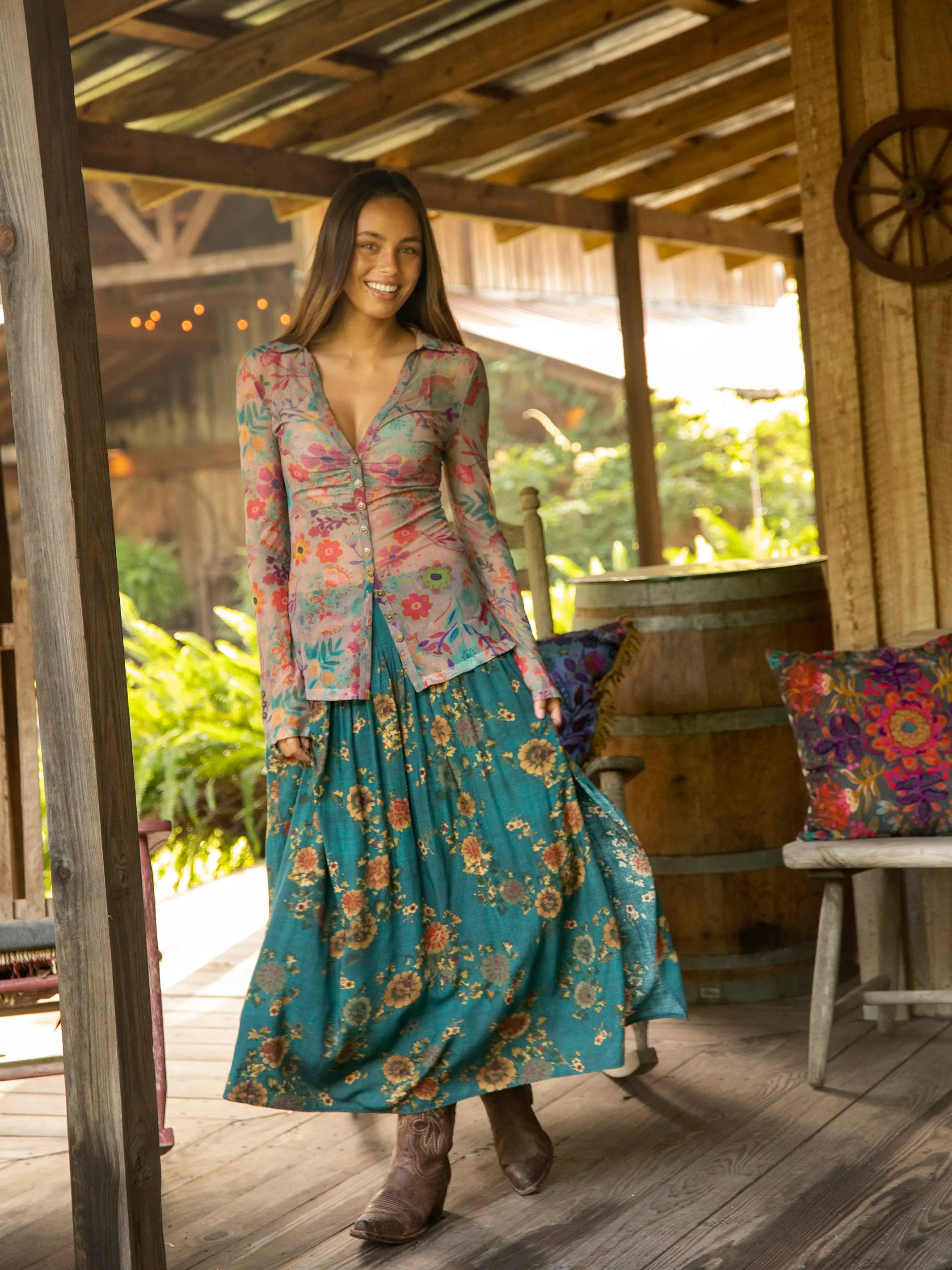 Hanna Convertible Maxi Skirt - Blue Pink Floral Vines