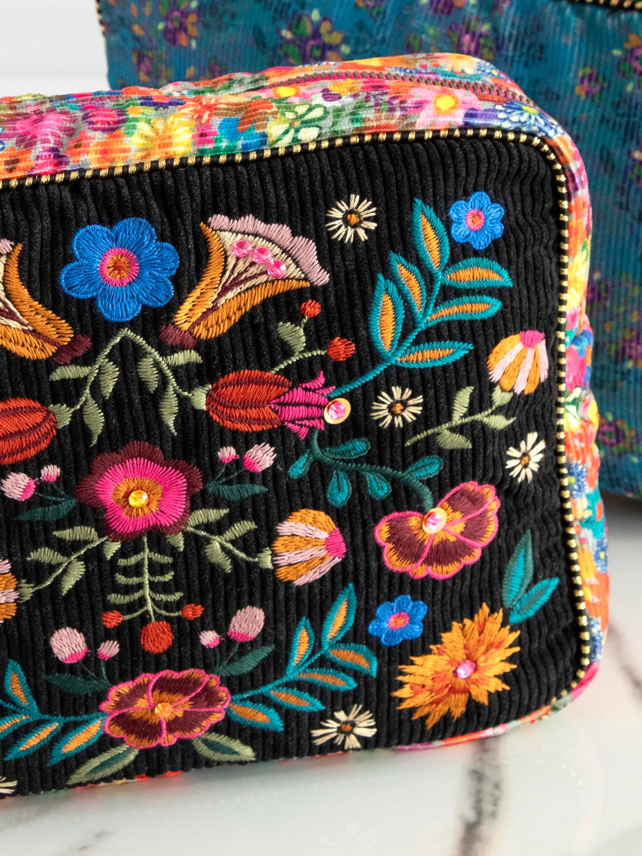 Embroidered Corduroy Cosmetic Pouch - Black Folk Flower