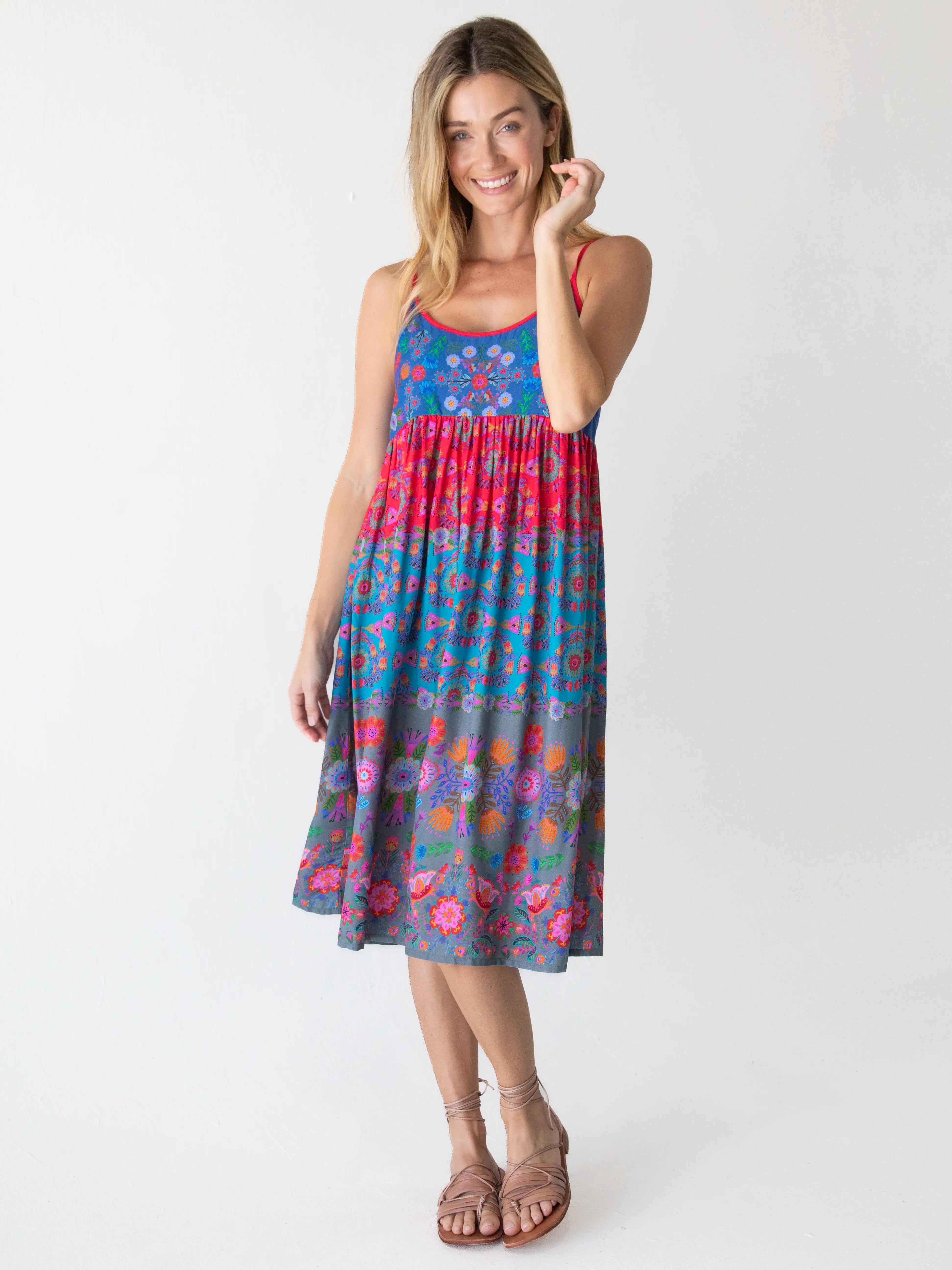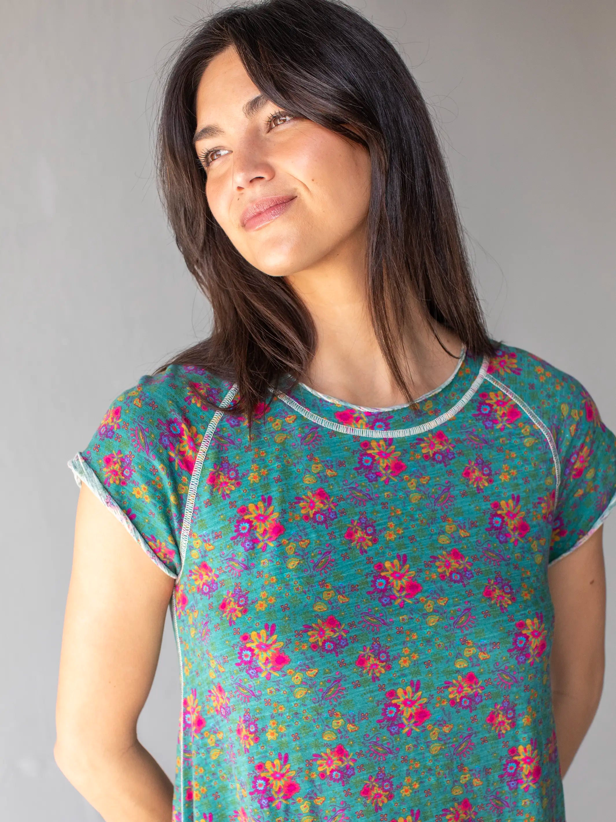Lily Knit Cotton Tee Dress - Turquoise Floral Medallions