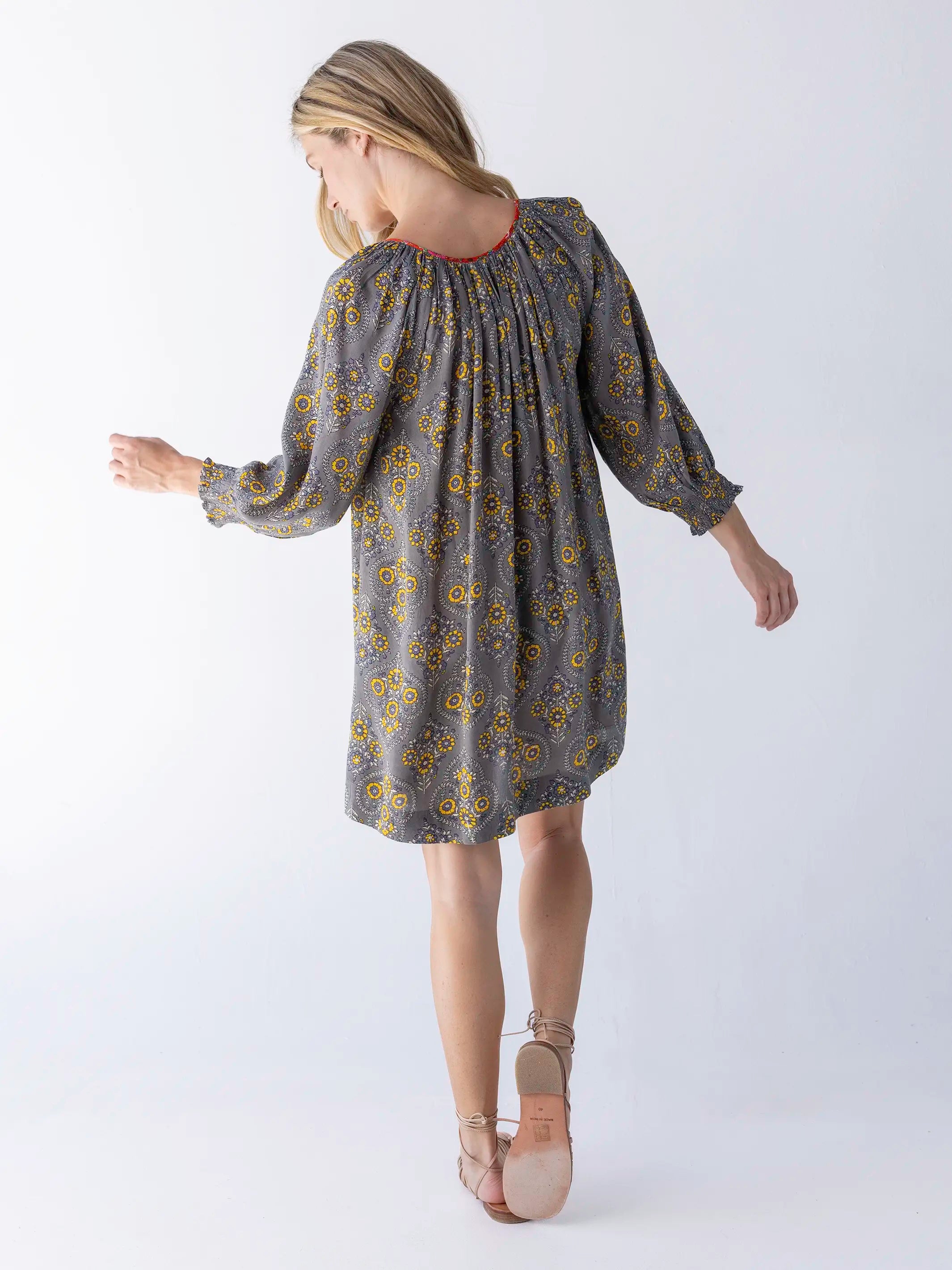 April Mini Dress - Grey Yellow Scrolls