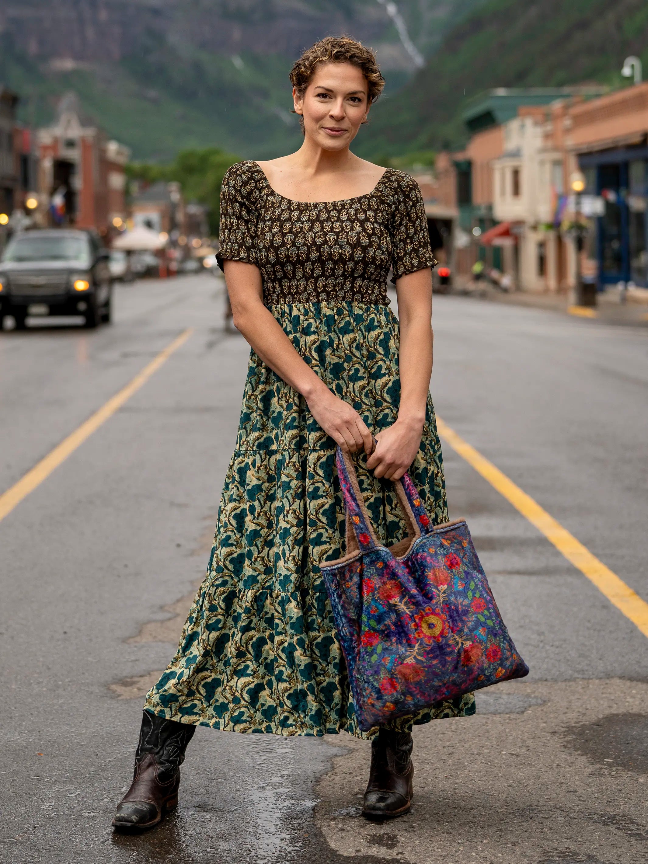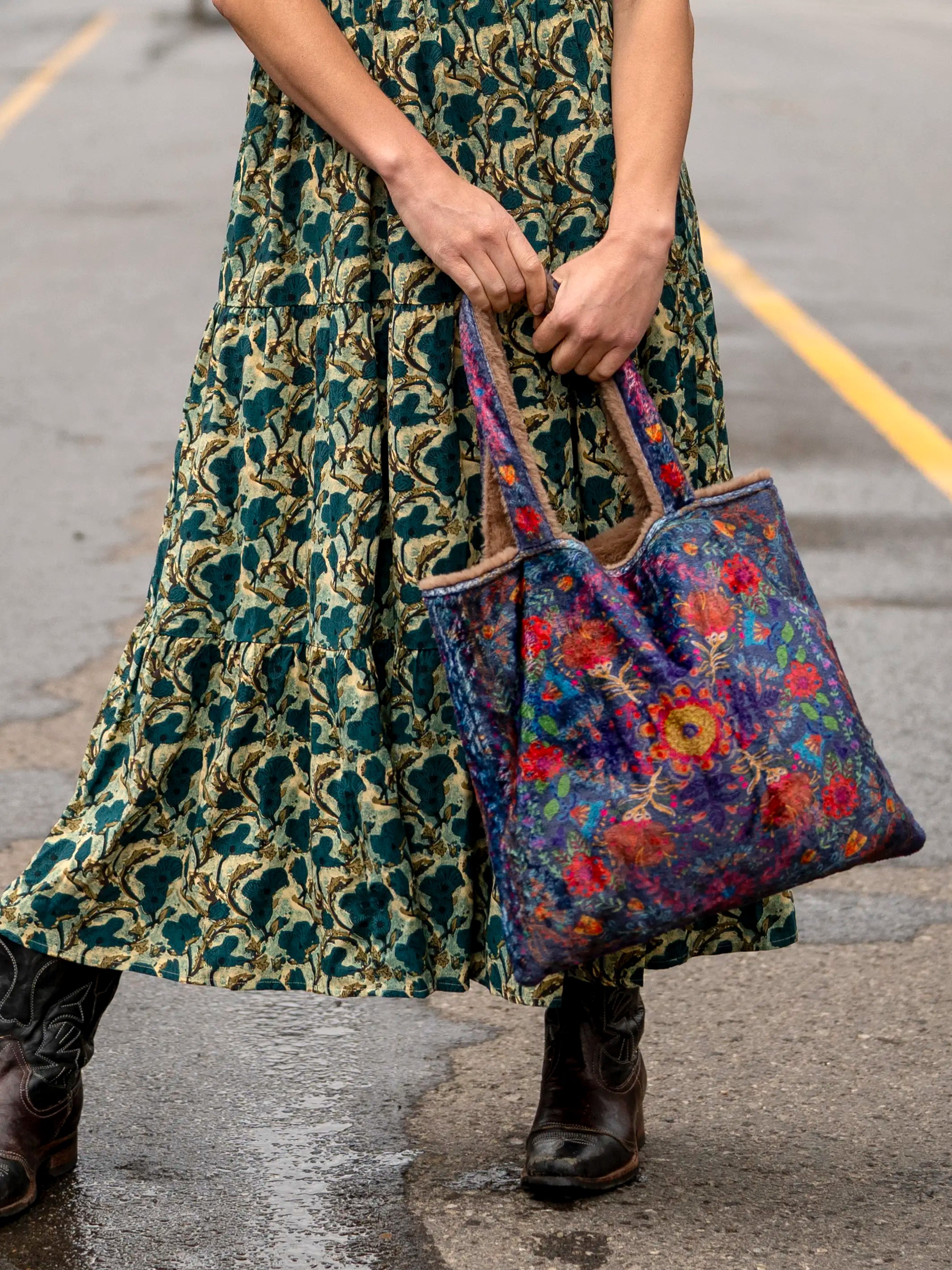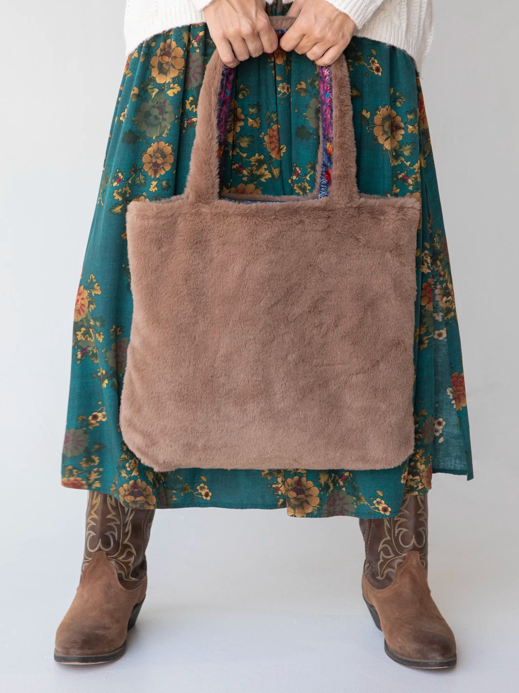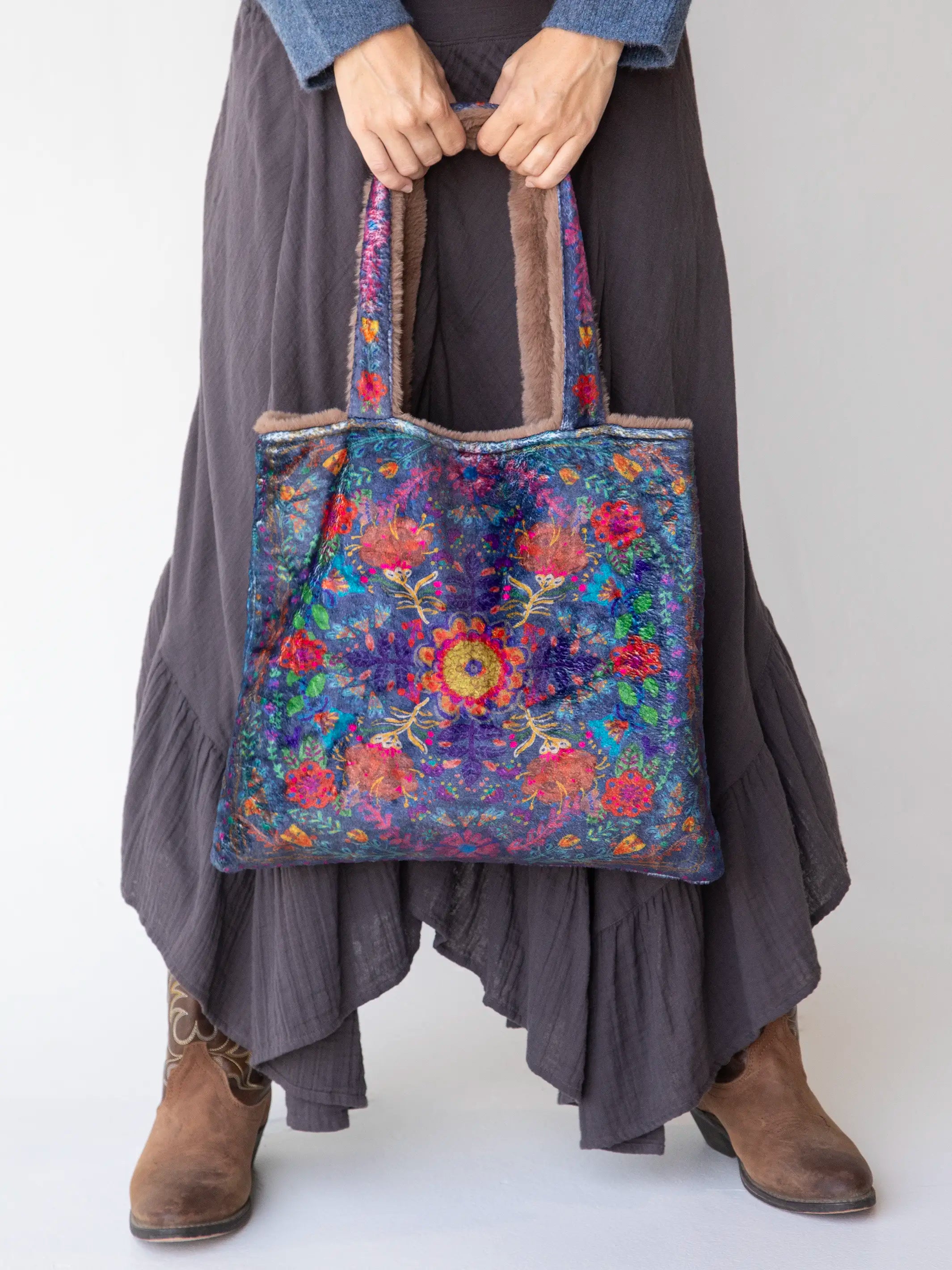 Reversible Faux Fur Tote Bag - Charcoal Folk Flower