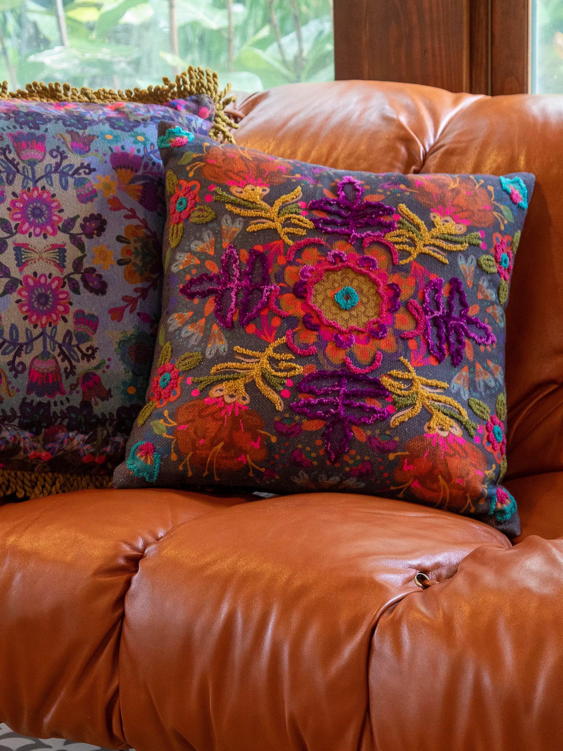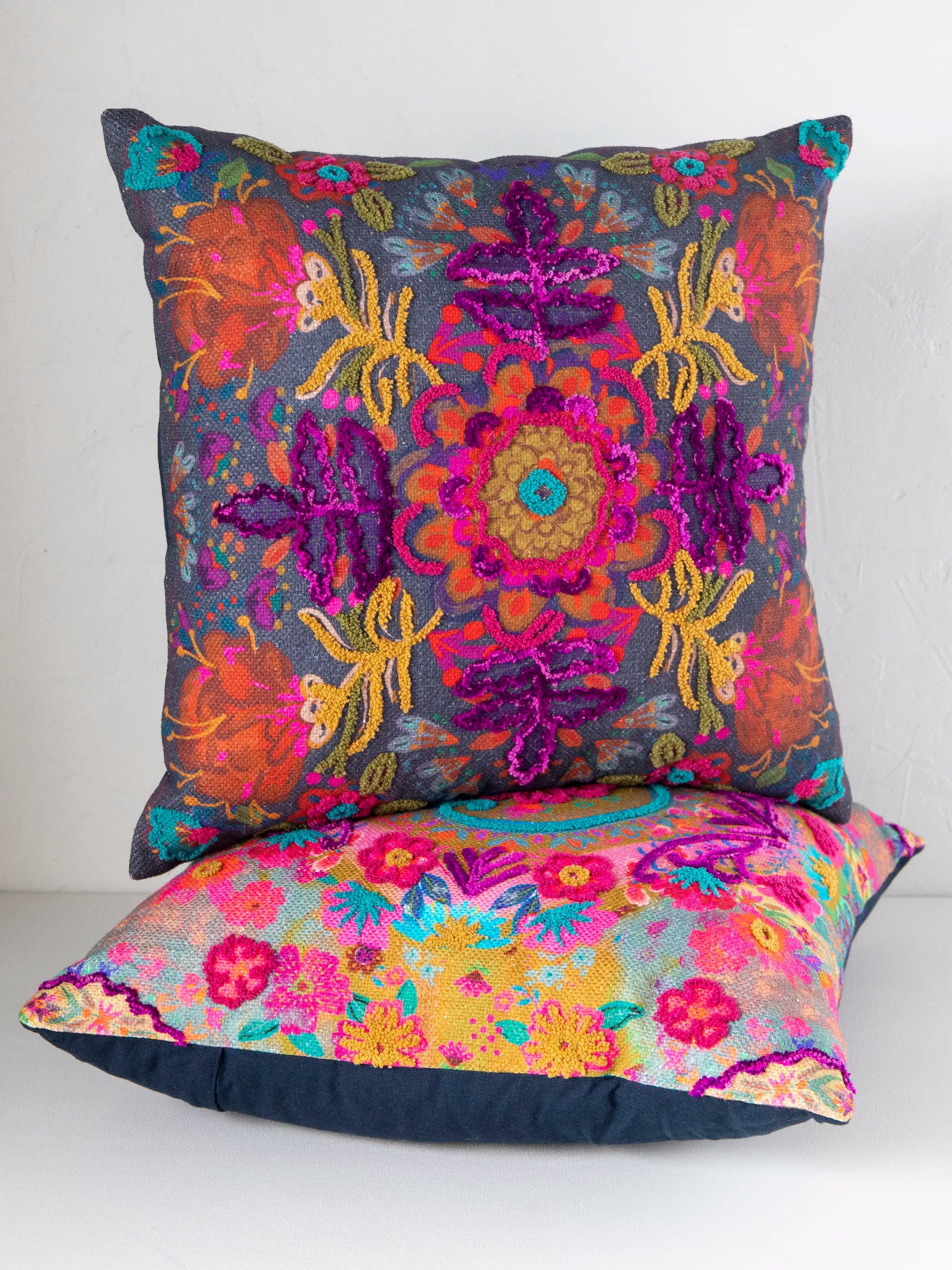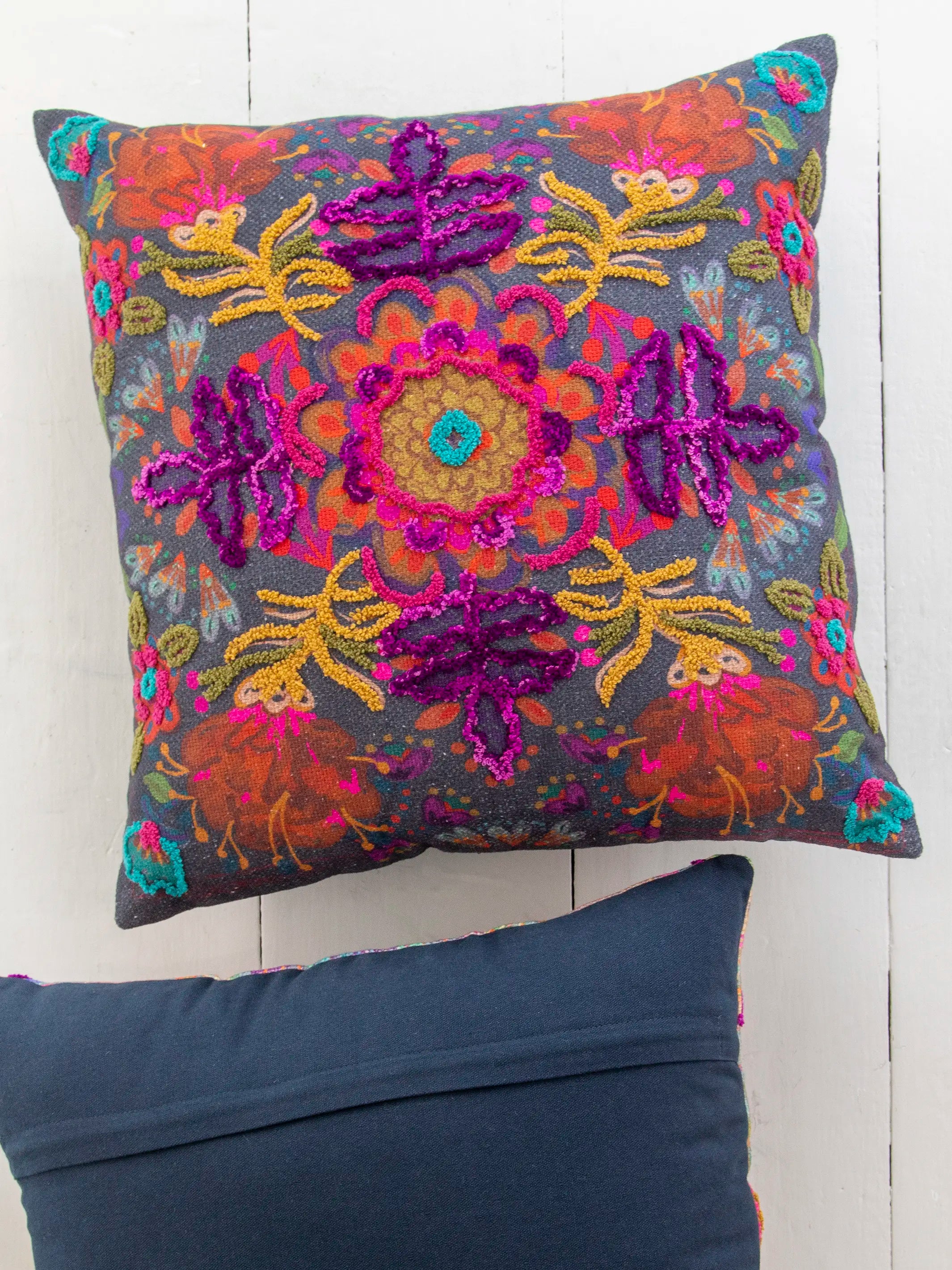 Tufted Bungalow Pillow - Charcoal Folk Flower