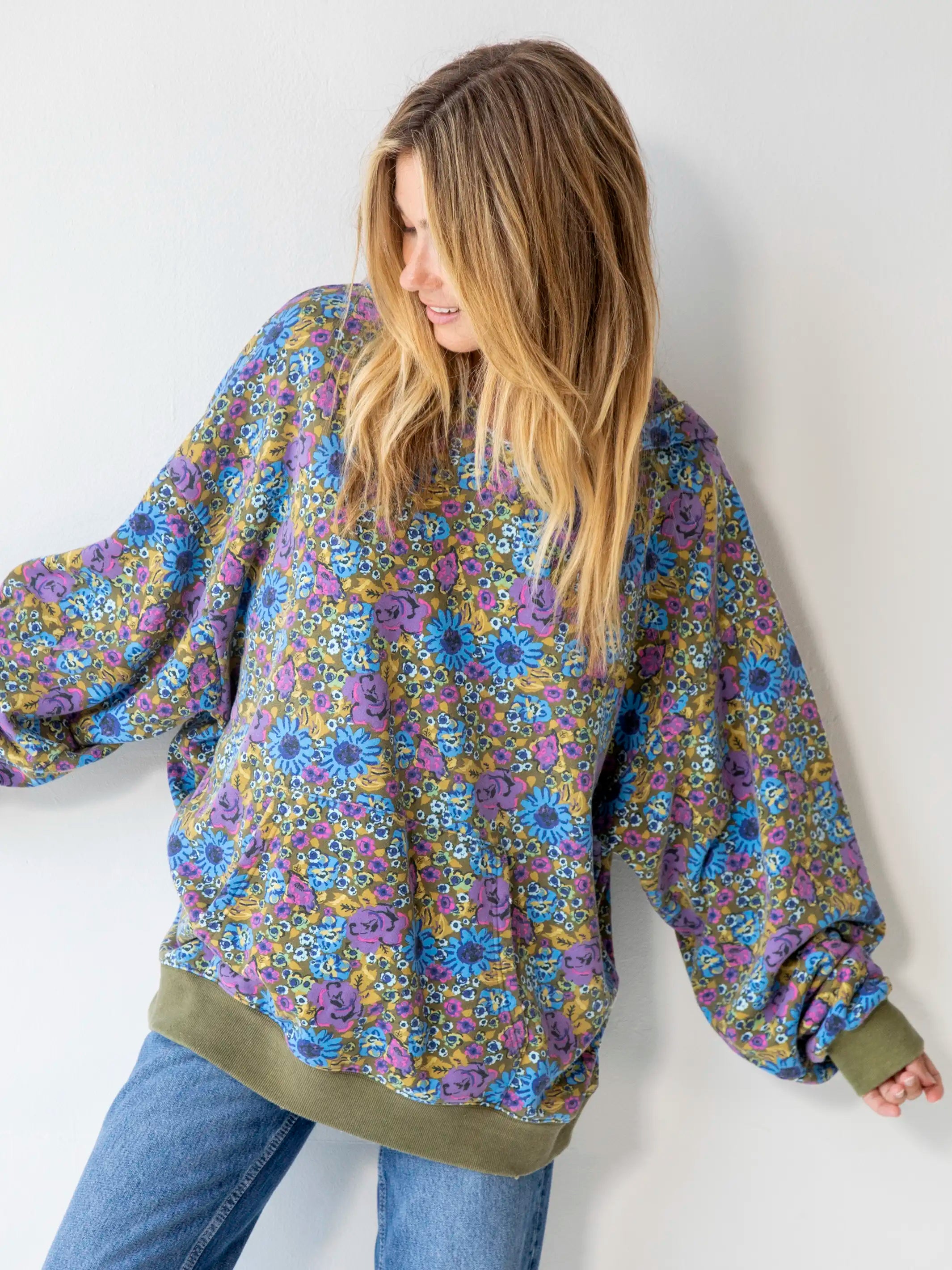 Oversized Printed Sweatshirt - Blue Rose Purple Daisy