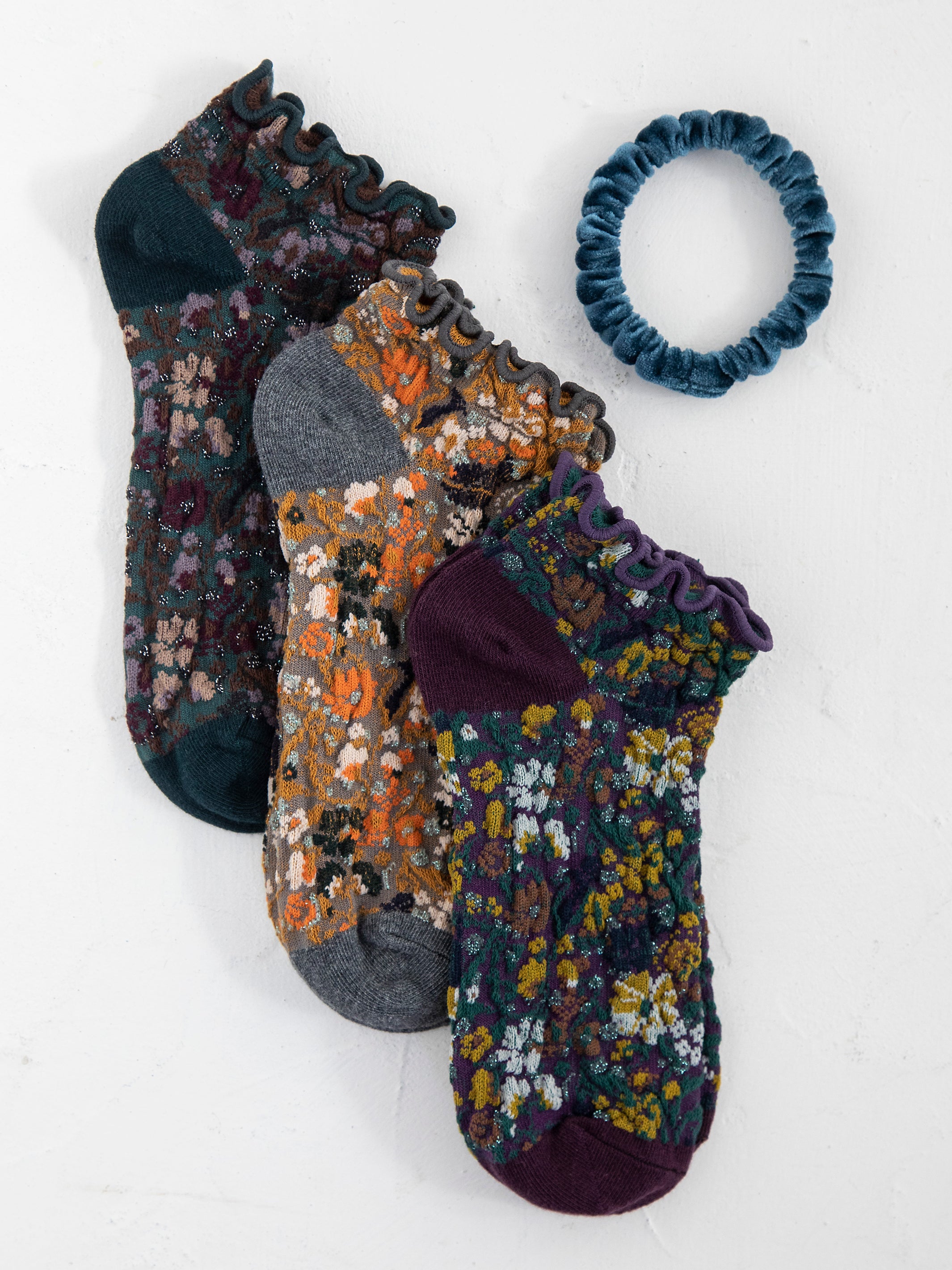Blossom Ankle Socks & Scrunchie, Set of 3 - Dark Floral