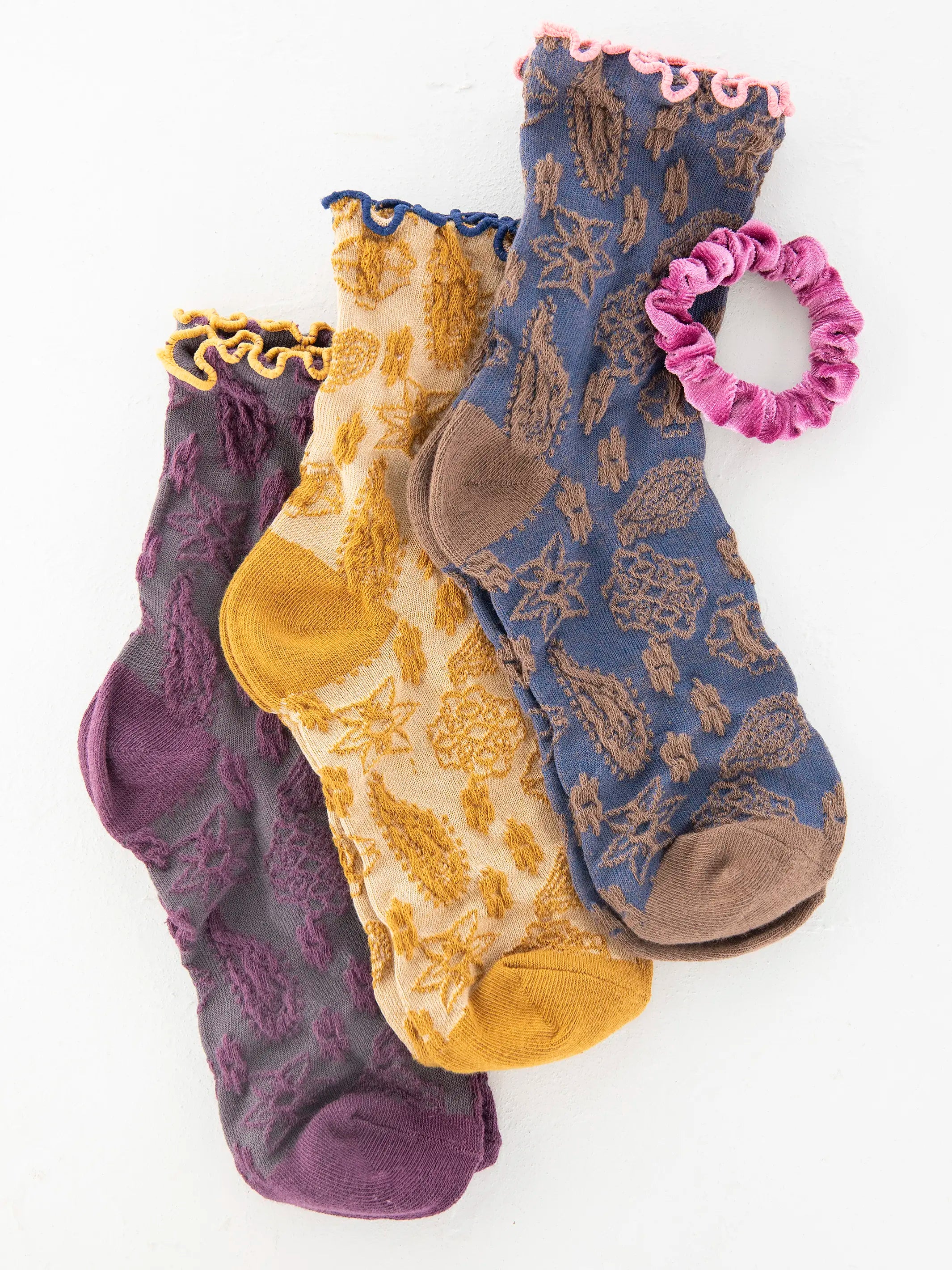 Blossom Crew Socks & Scrunchie, Set of 3 - Indigo