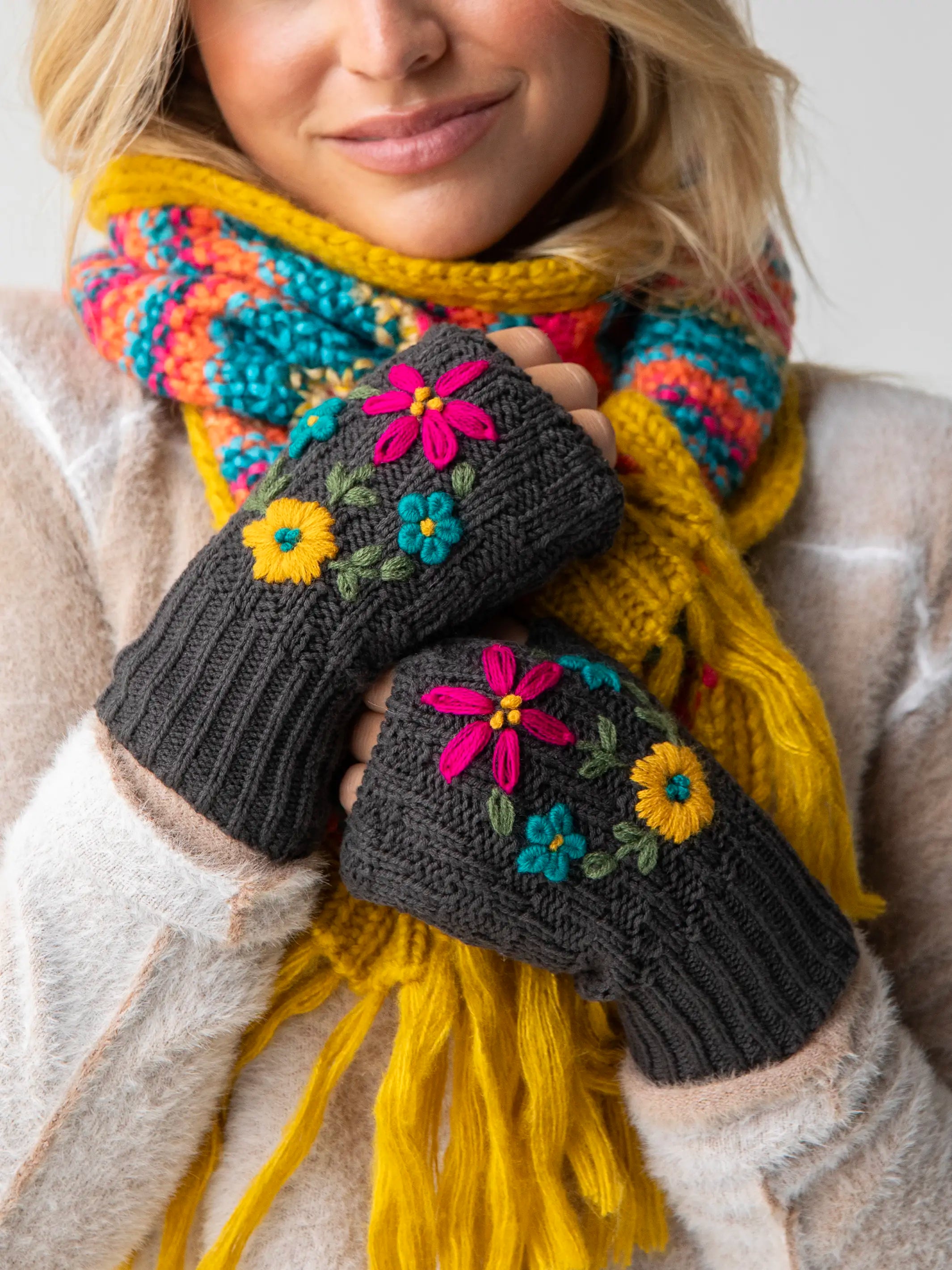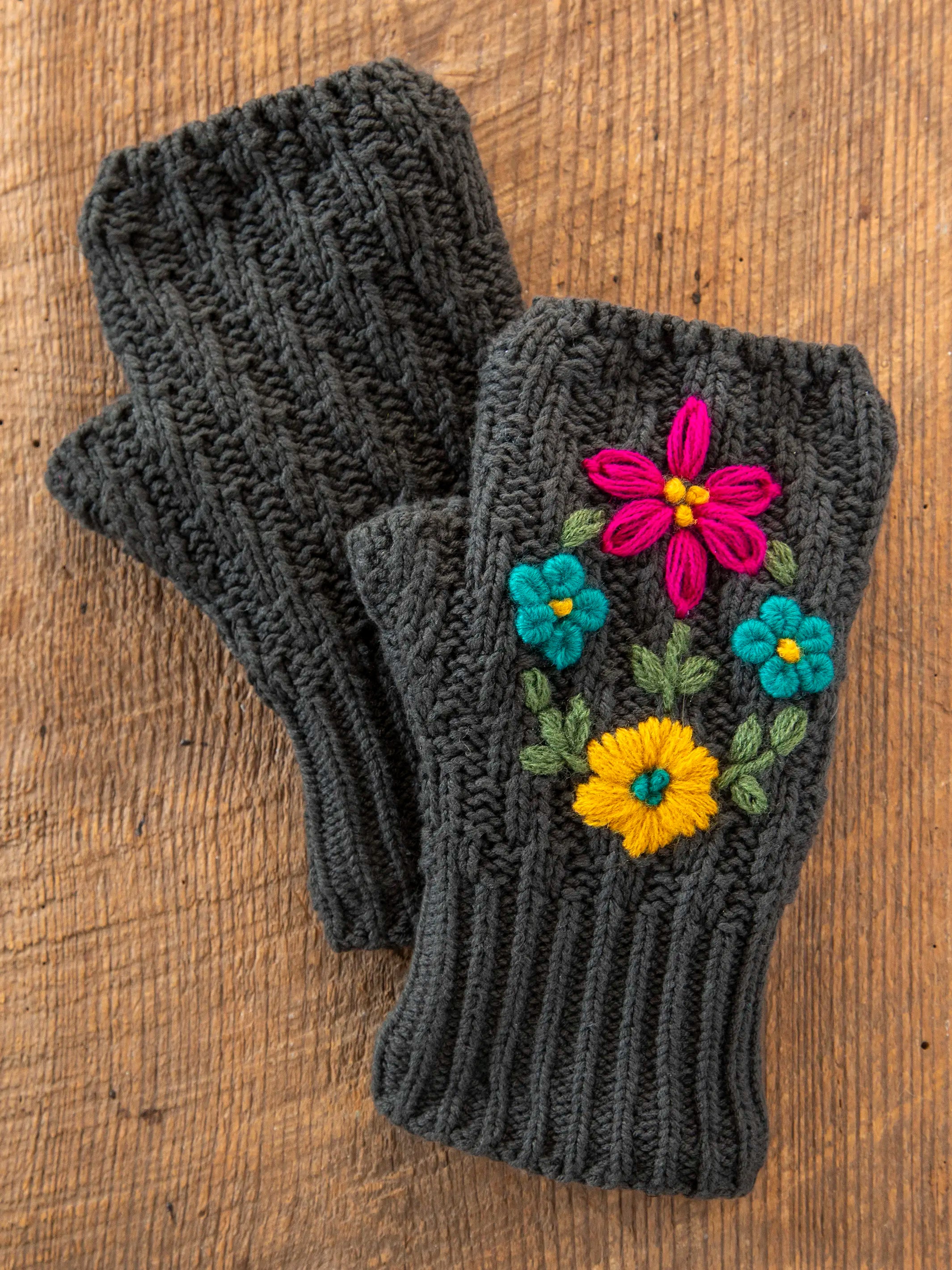 Embroidered Fingerless Gloves - Charcoal Folk Flower
