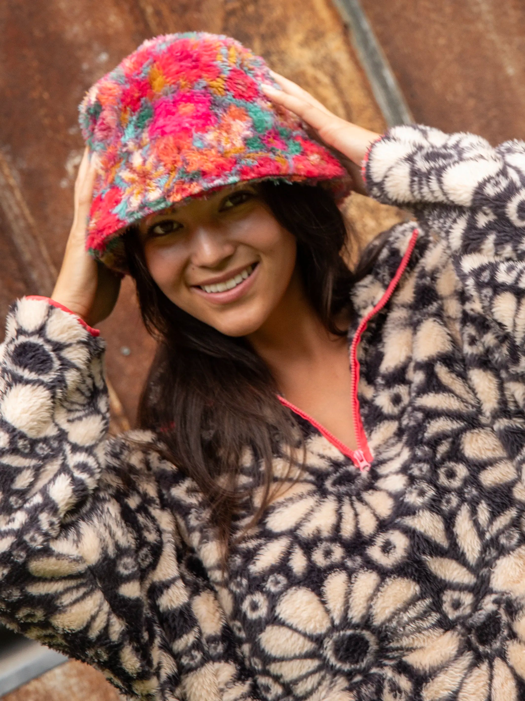 Sherpa Bucket Hat - Turquoise Pink Retro Floral