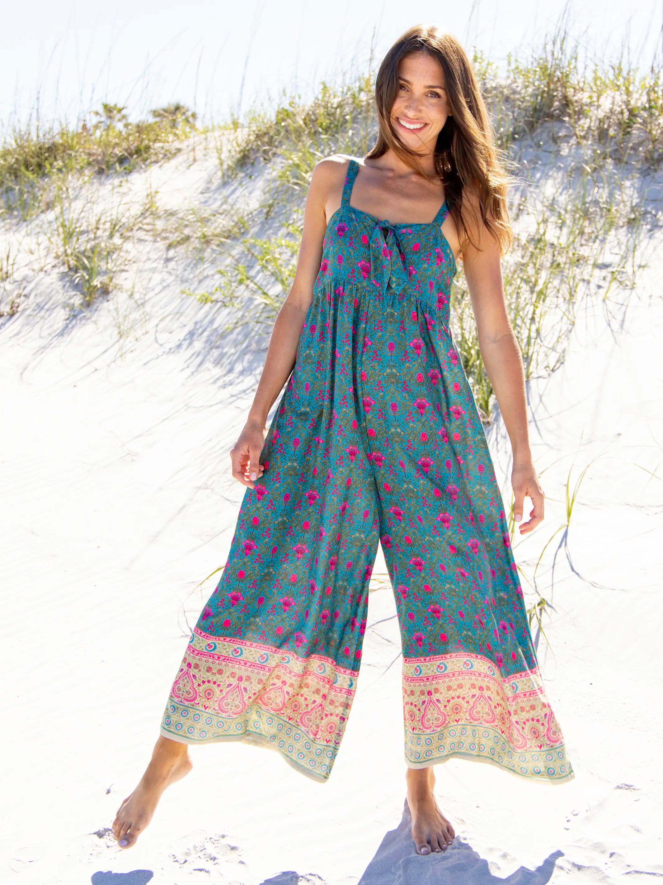 Patti Tie-Front Jumpsuit - Teal Pink Border