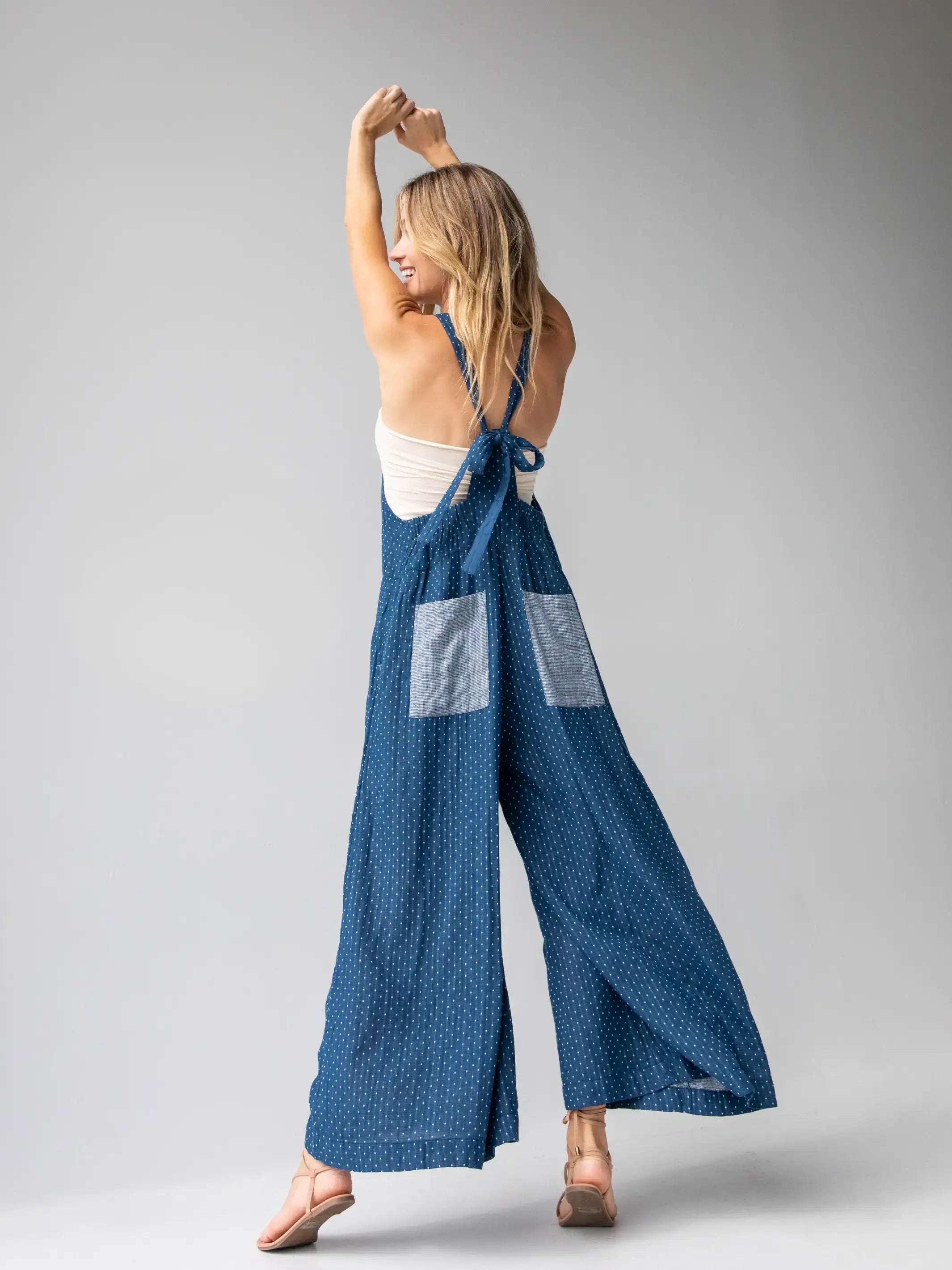 Dakota Tie Overall - Navy Polka Dots Cotton