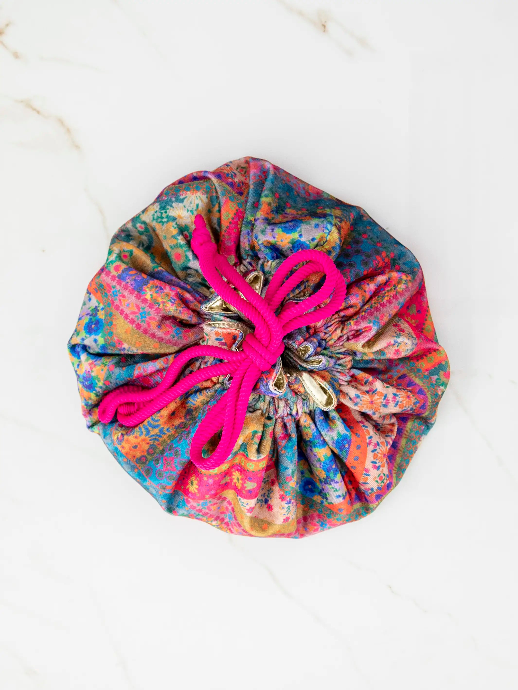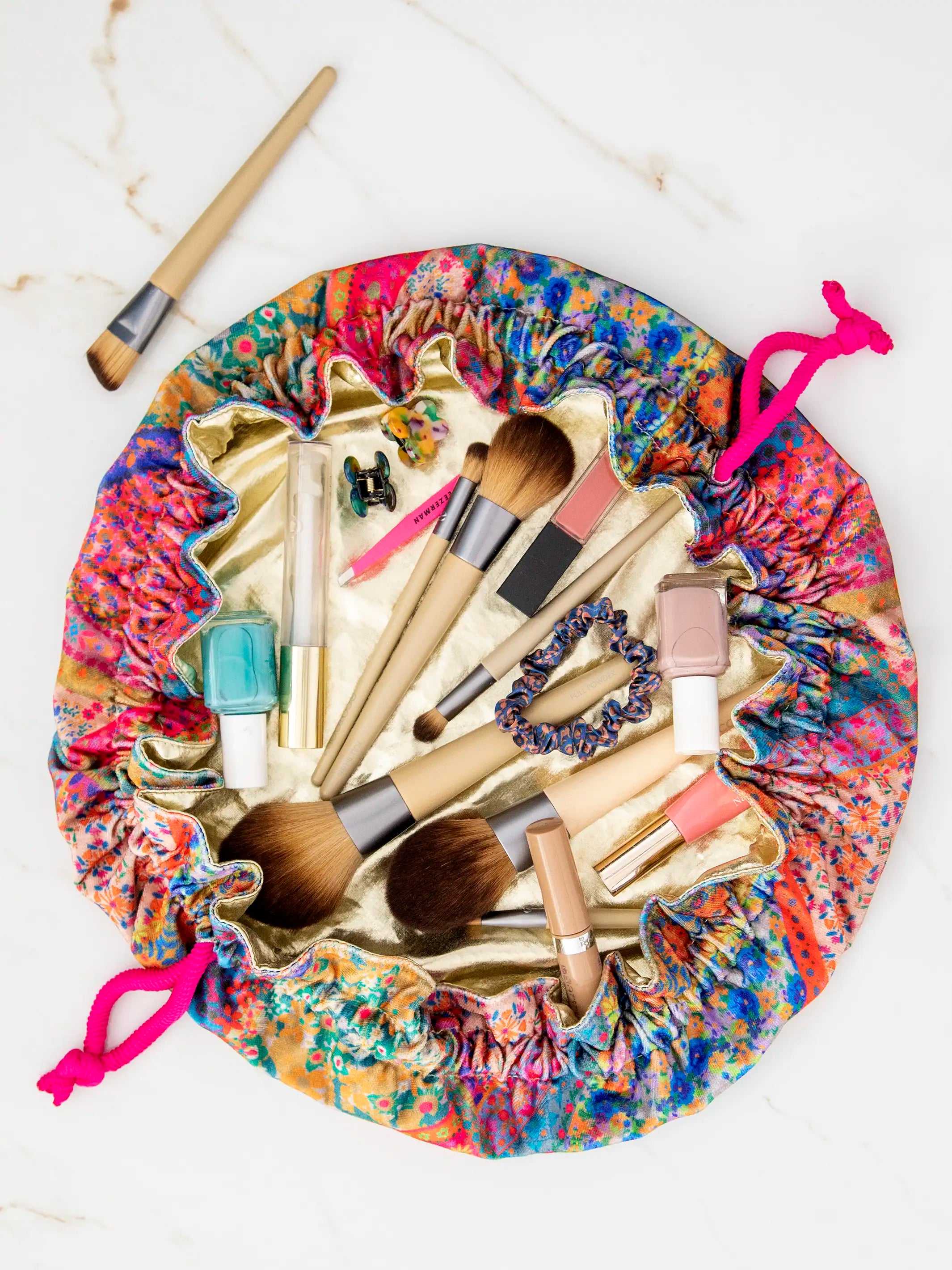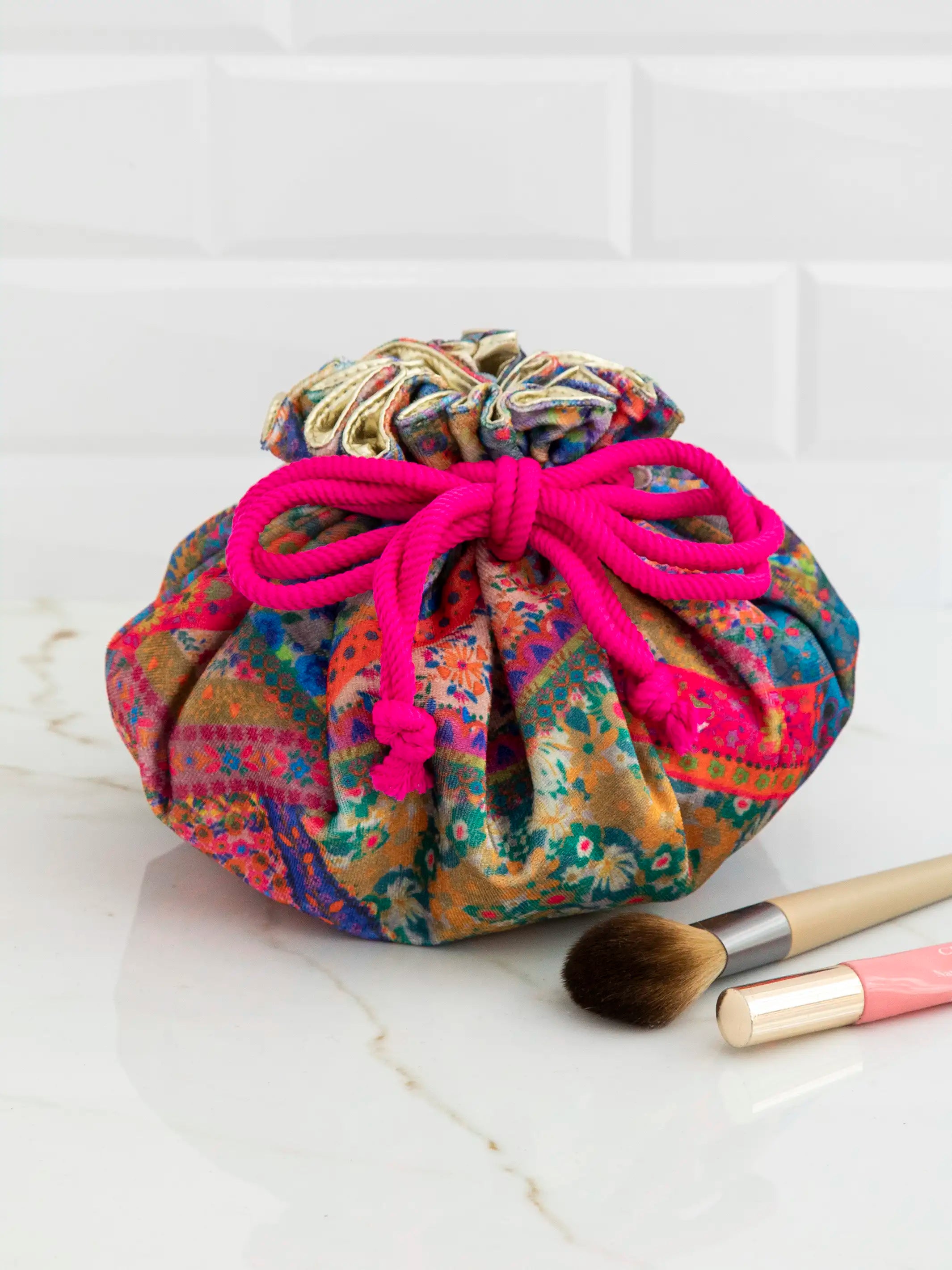 Drawstring Velvet Cosmetic Pouch - Folk Flower