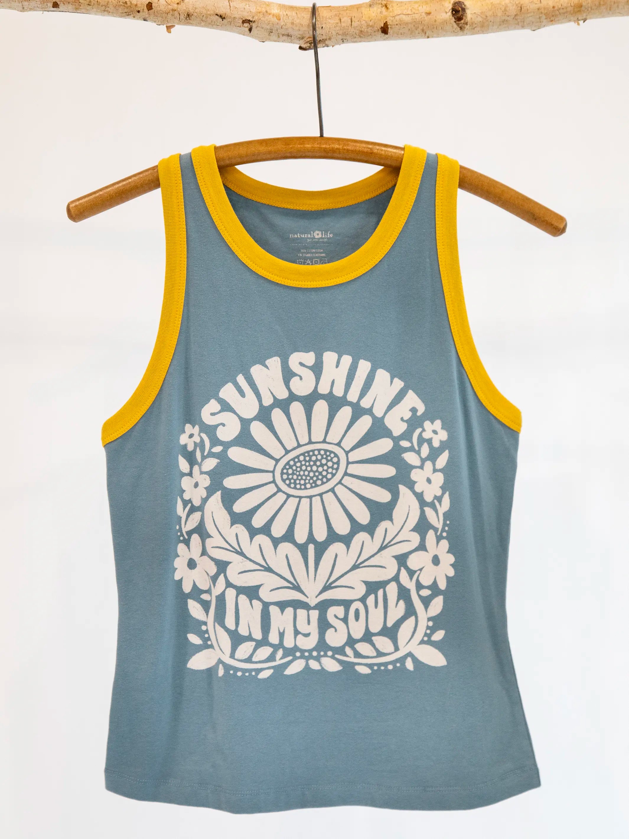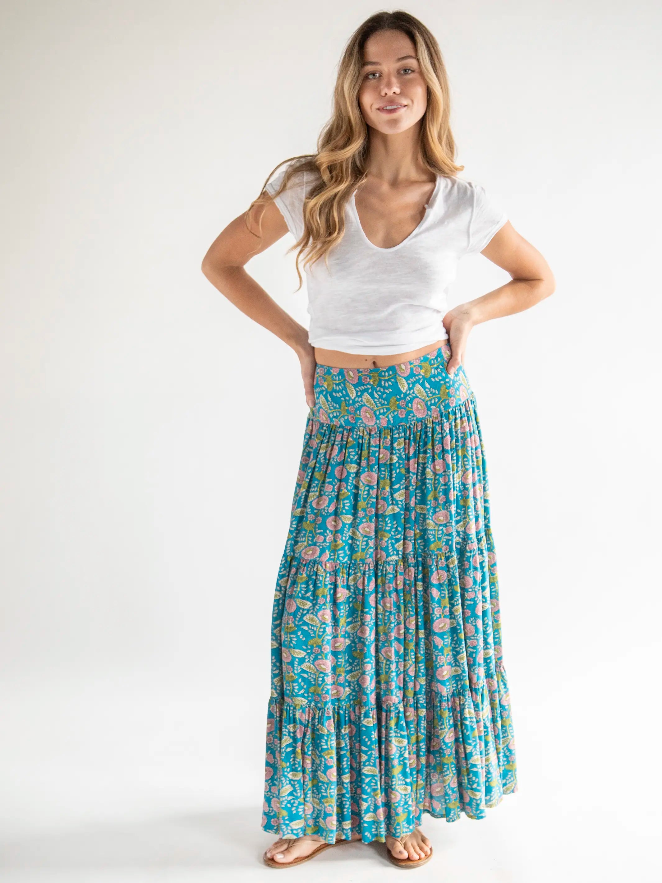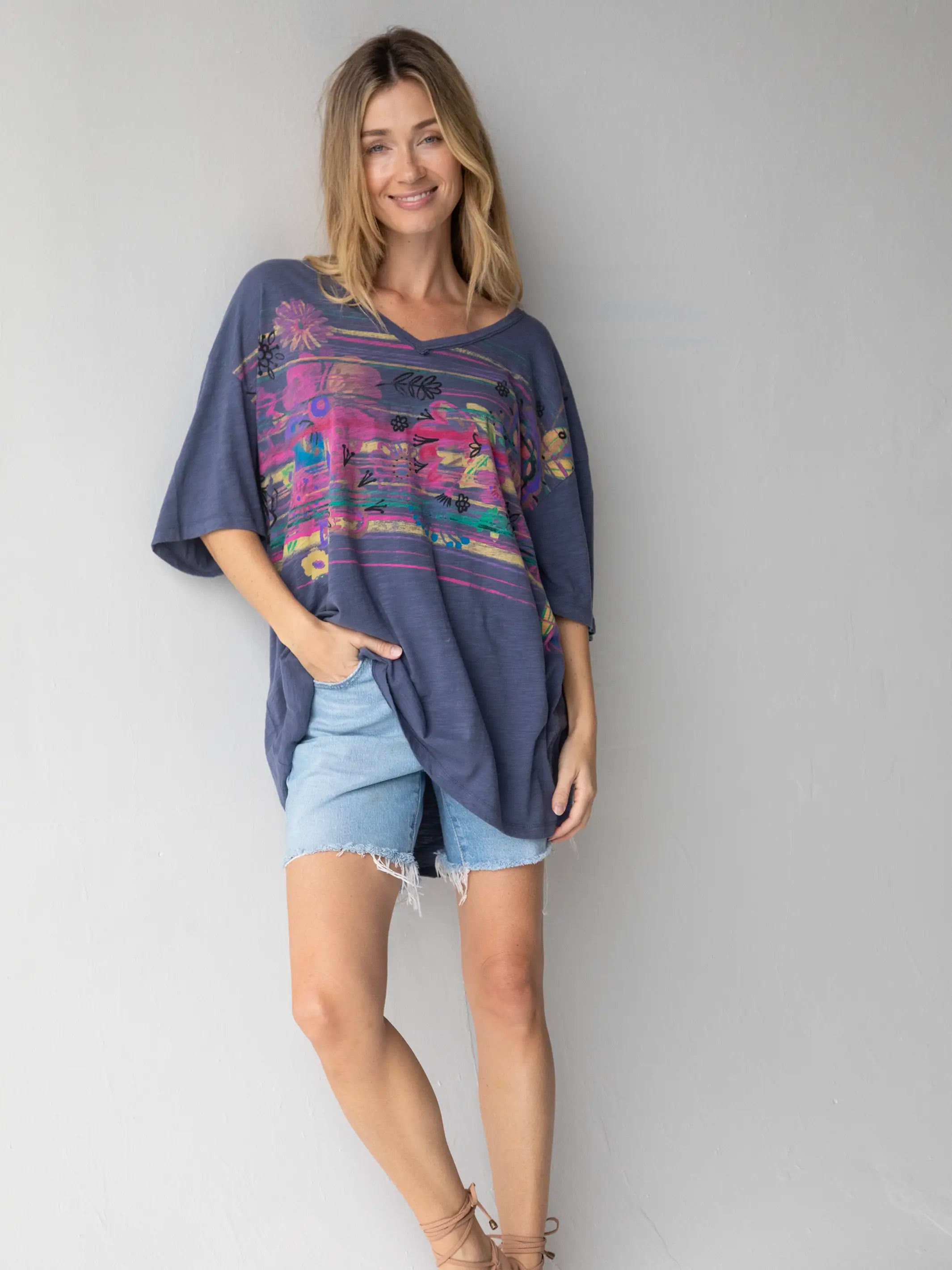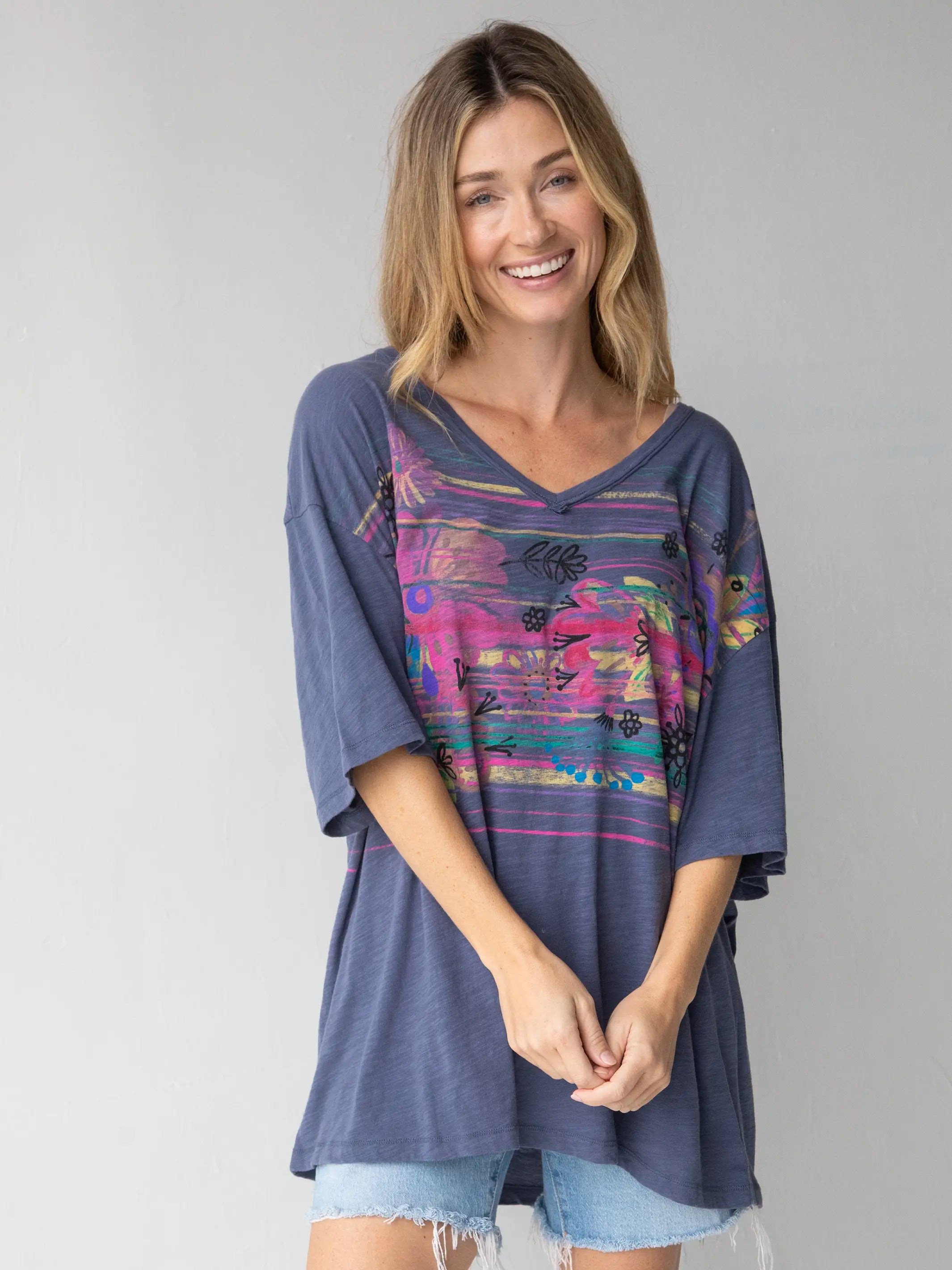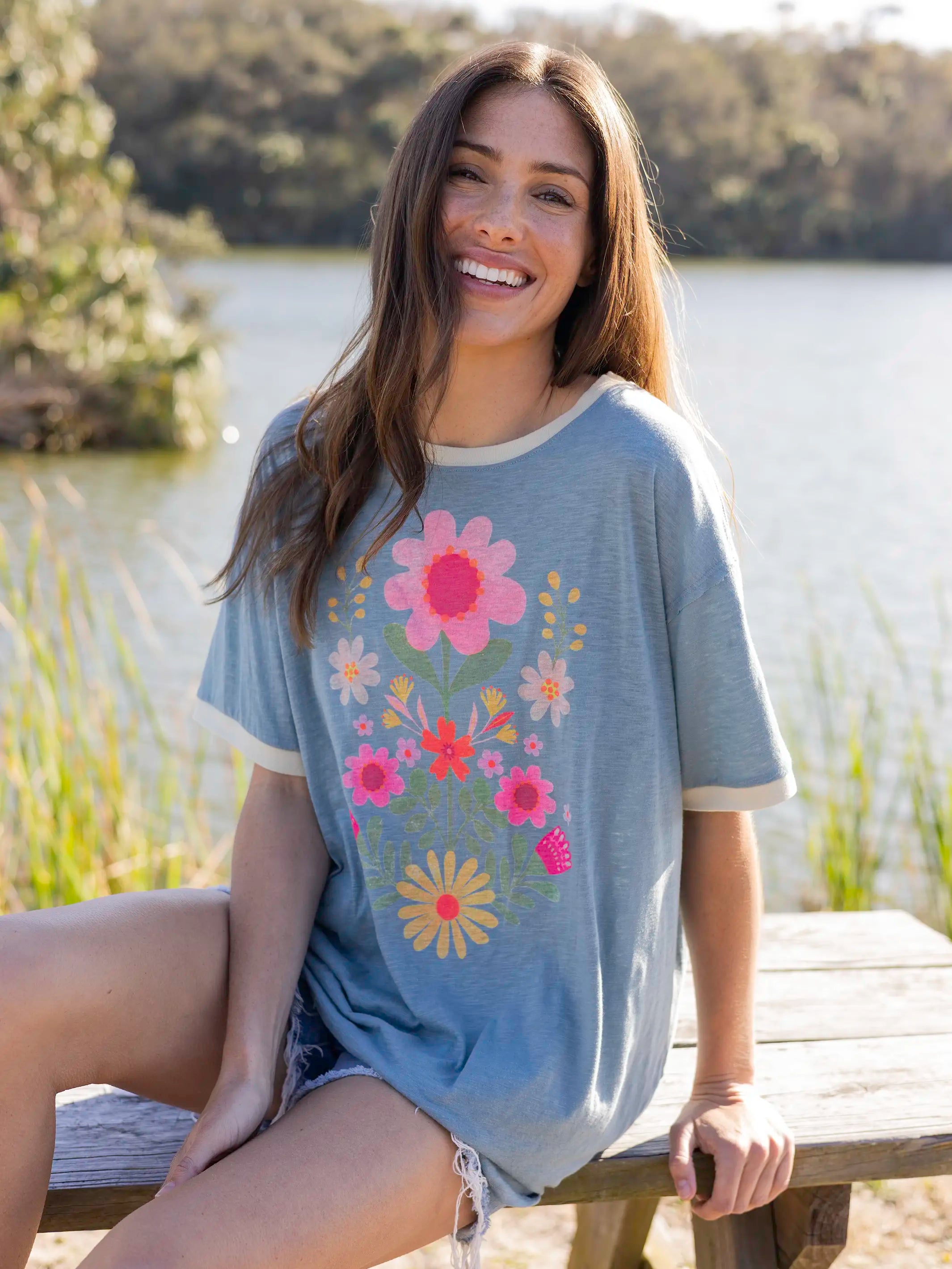 Ringer Oversized Tee Shirt - Blue Folk Flower