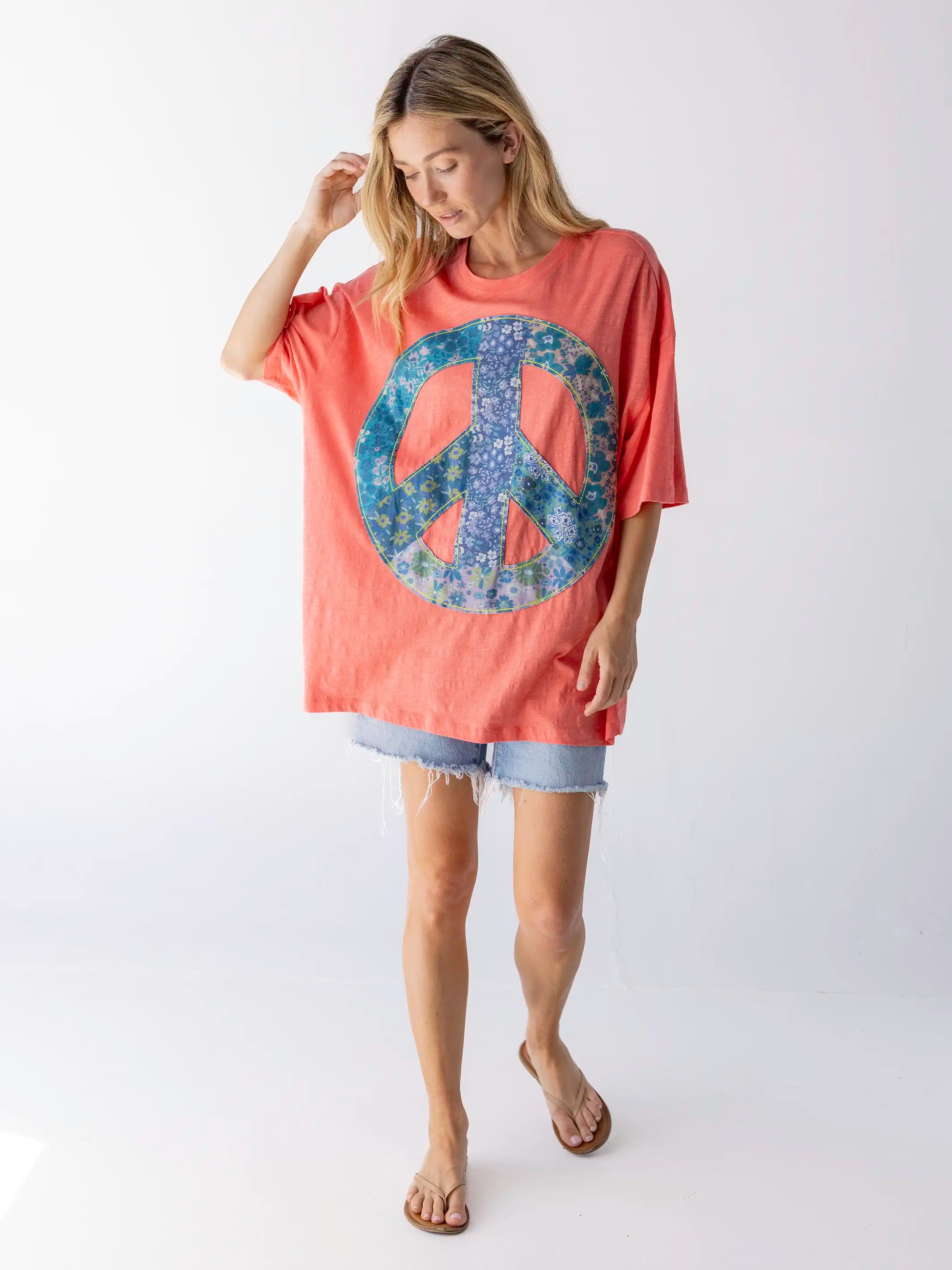 Oversized Cotton Applique Tee - Coral Peace Sign