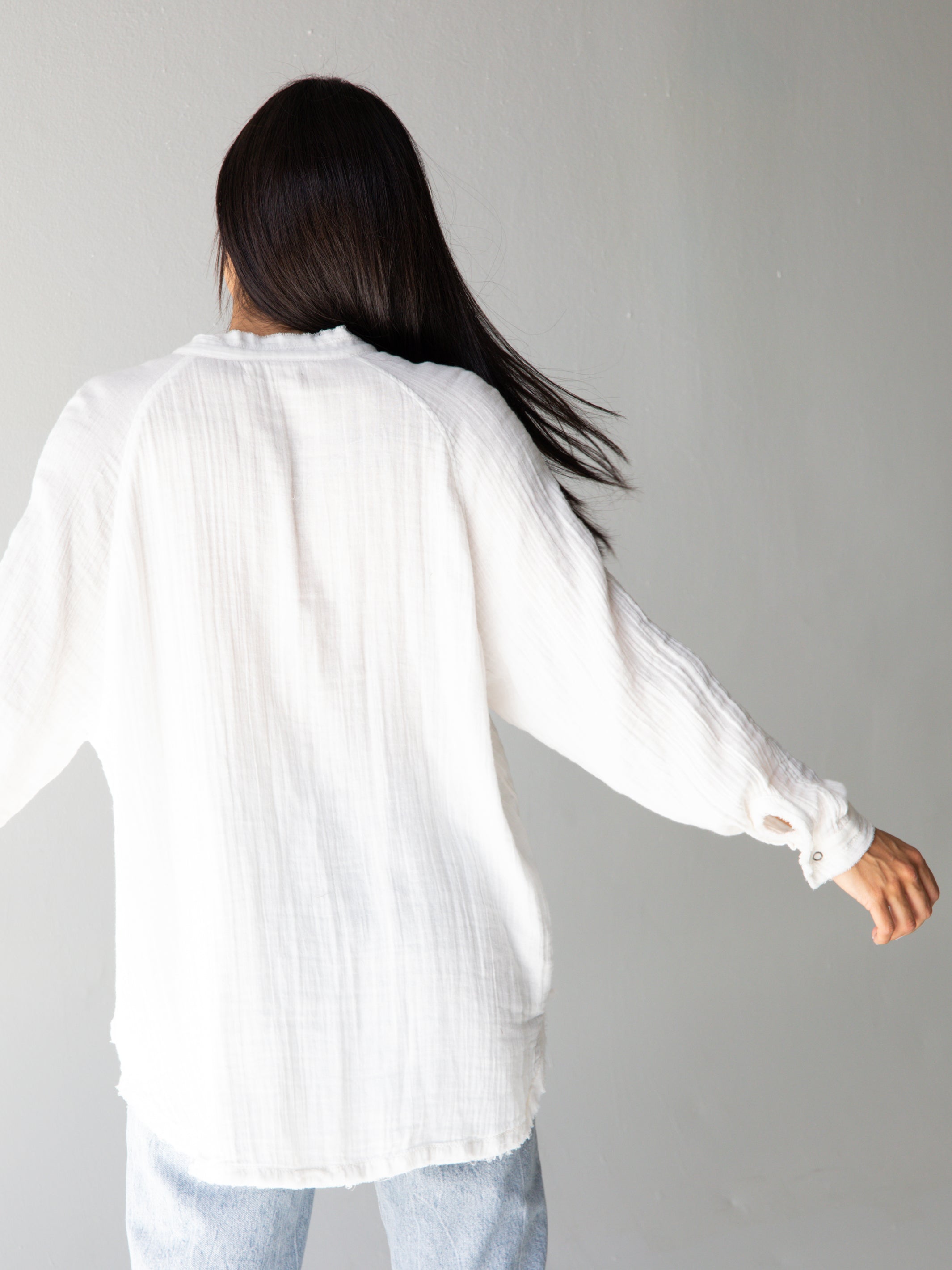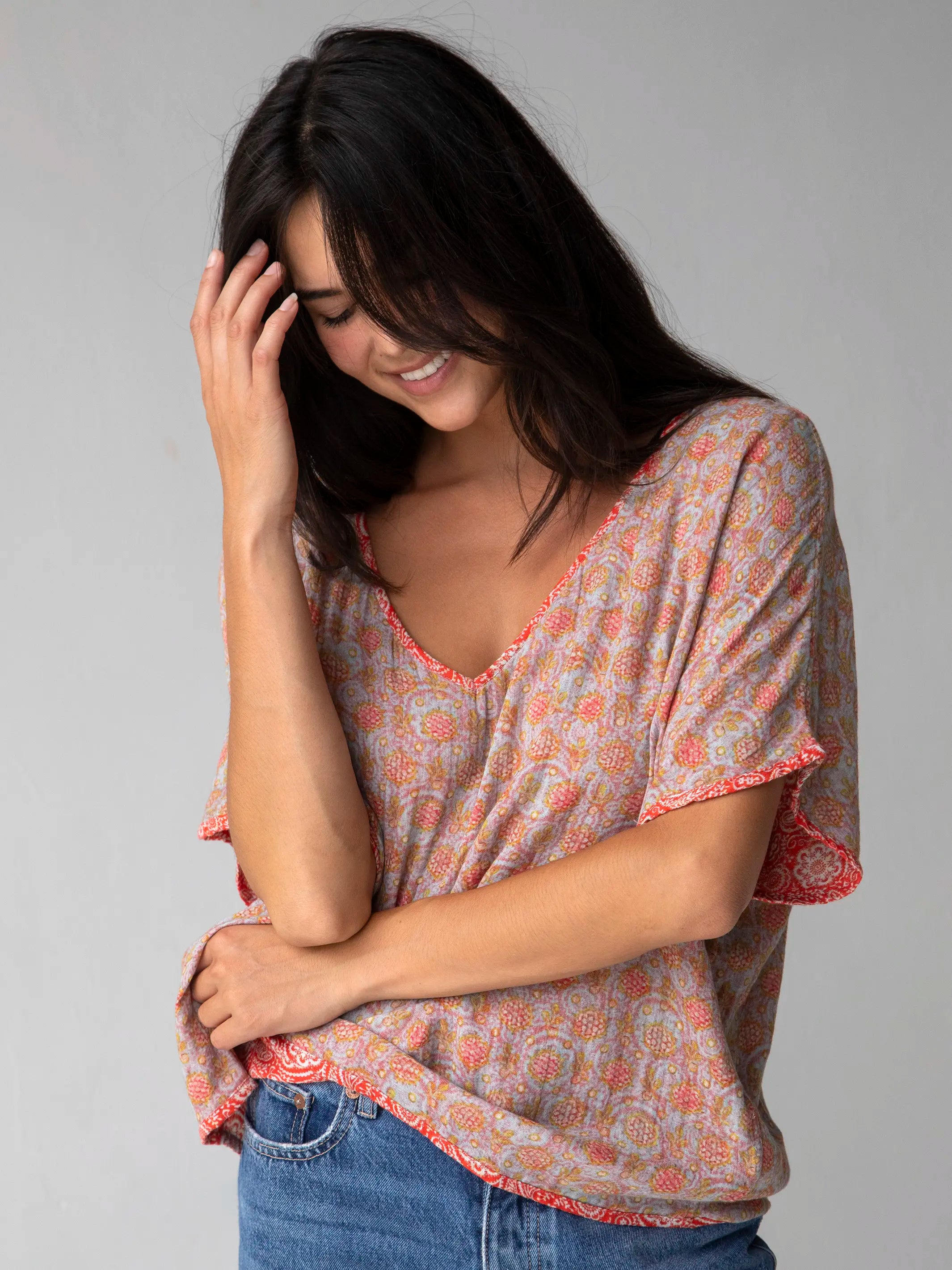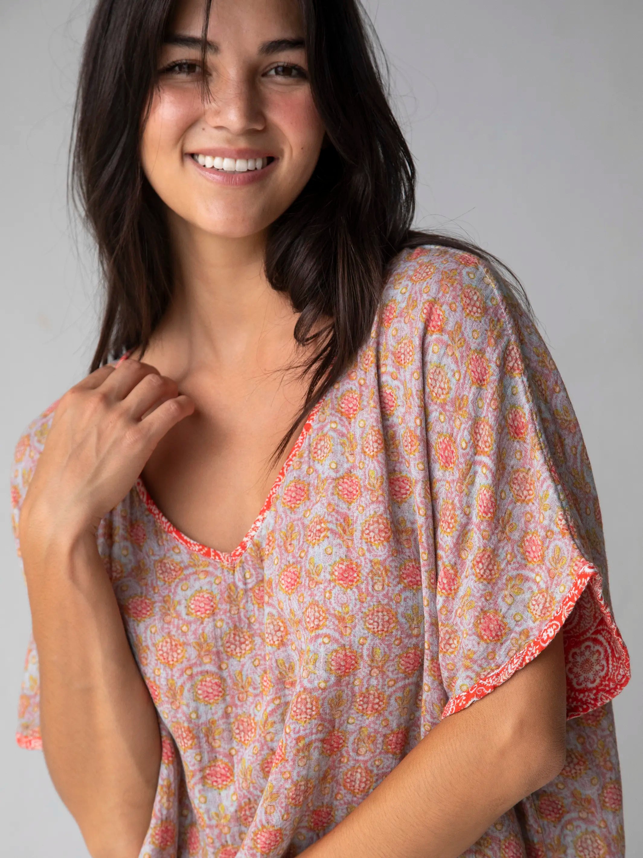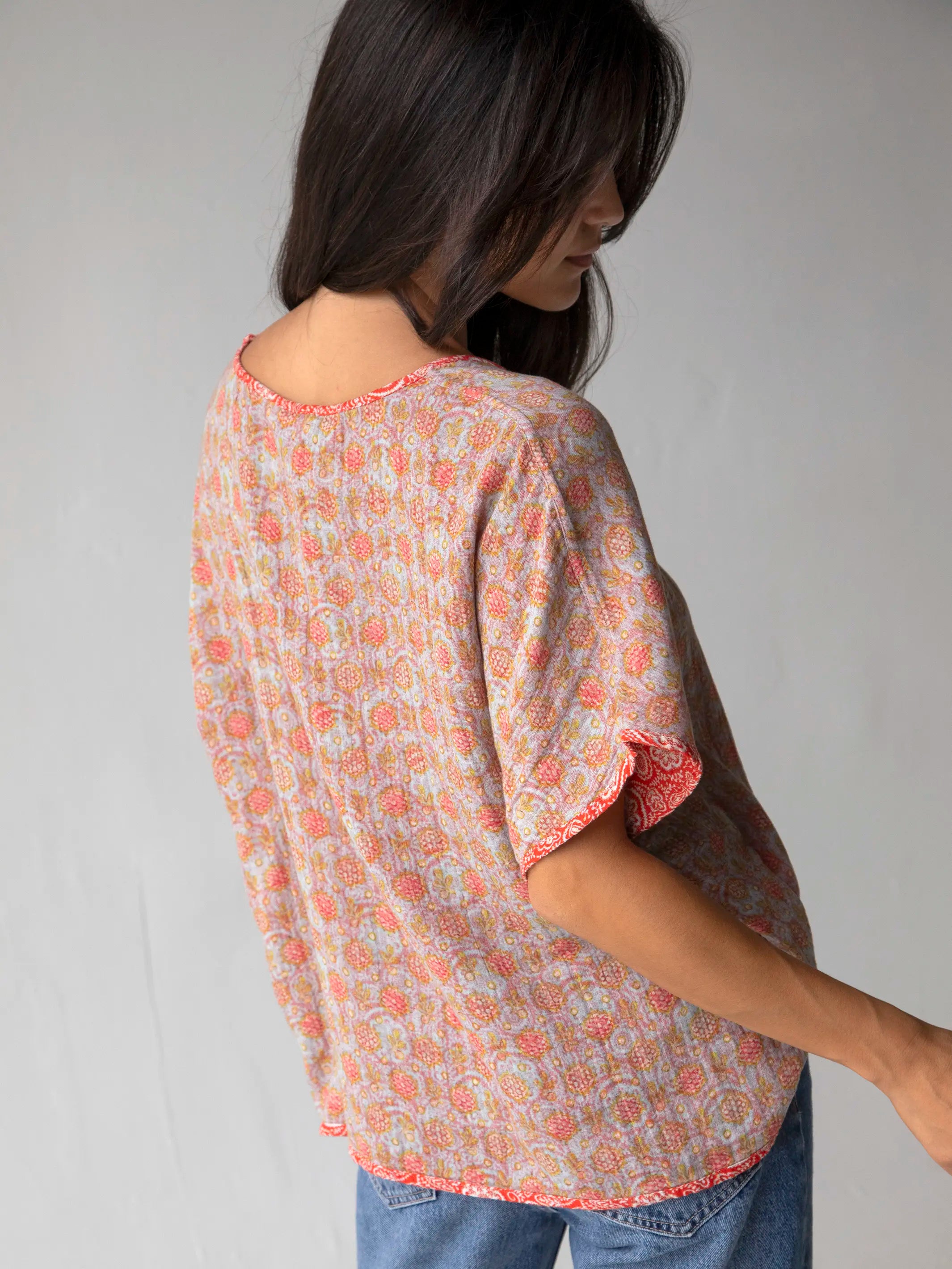 Reversible Gauze Easy V-Neck Top - Light Blue Red Blooms