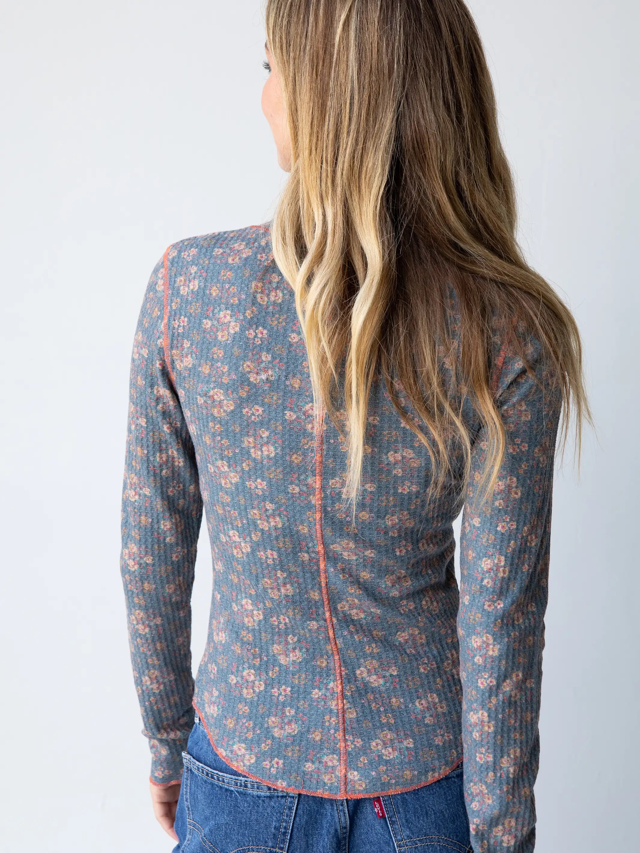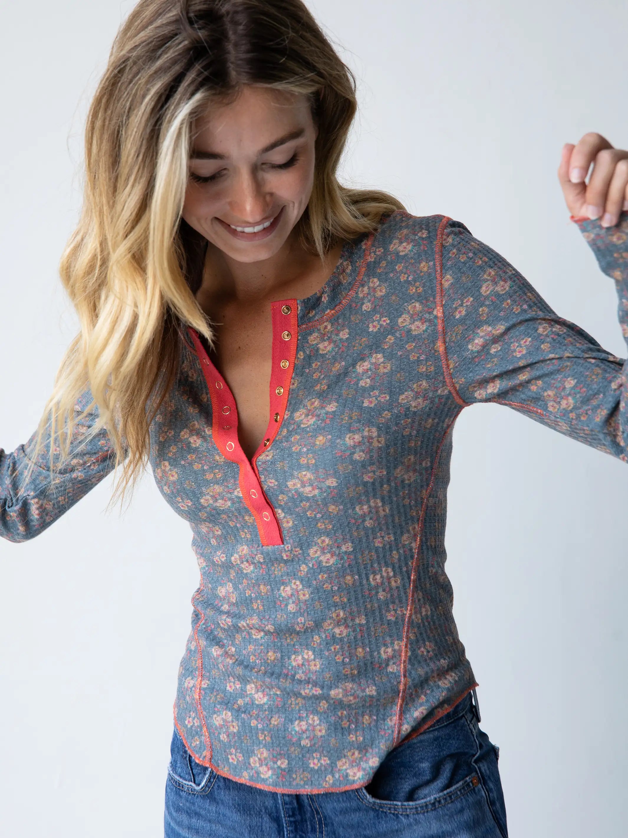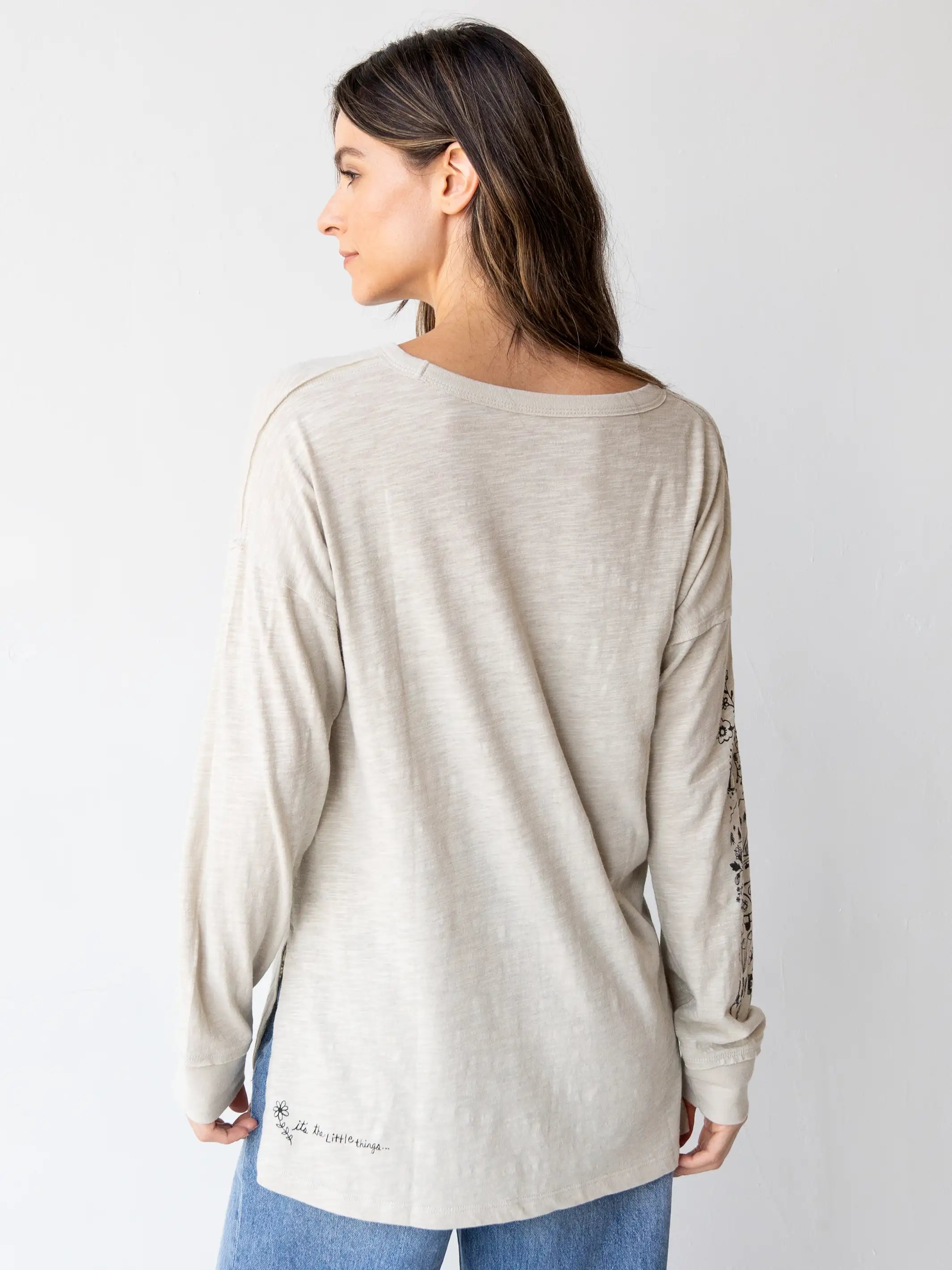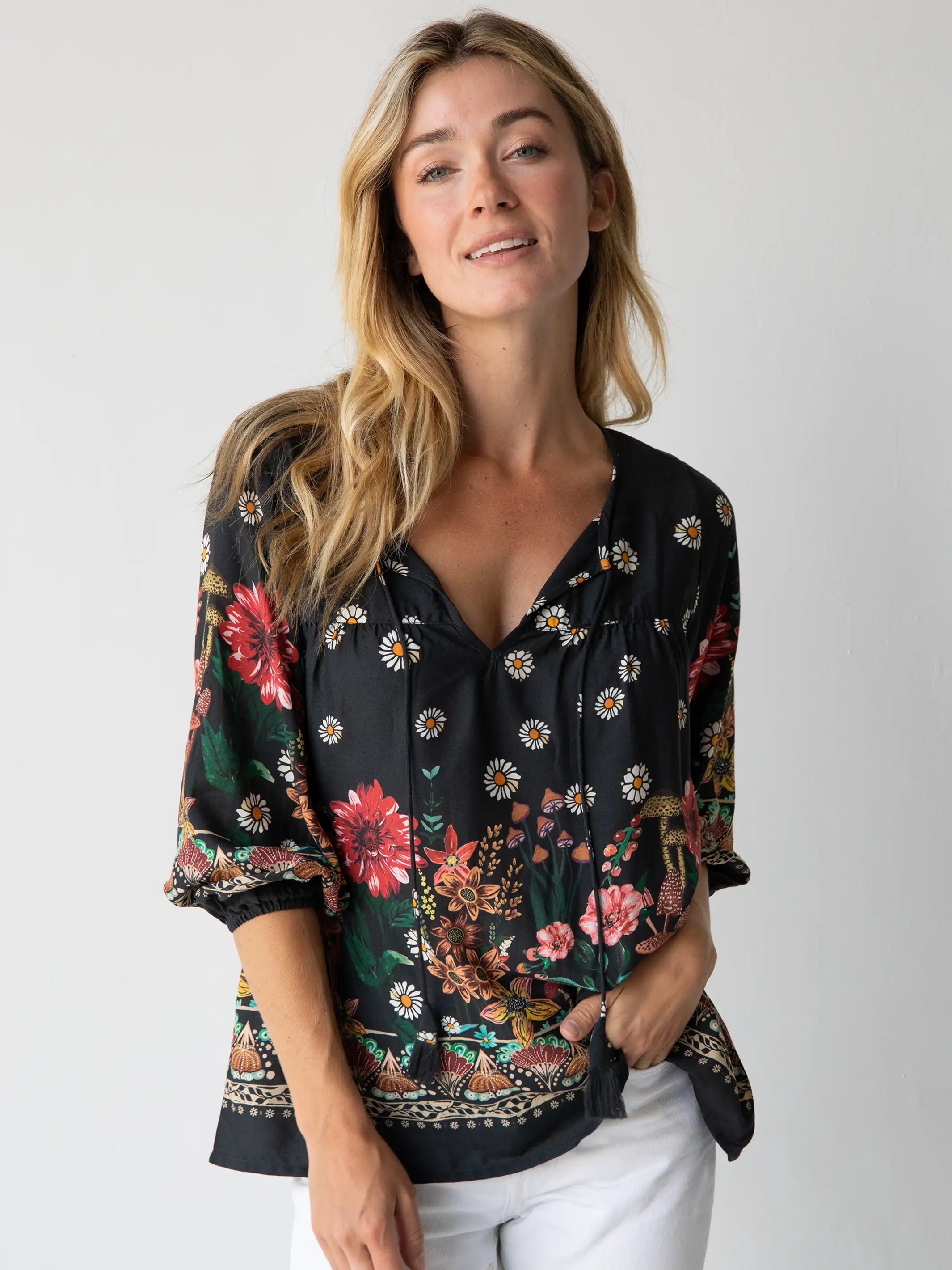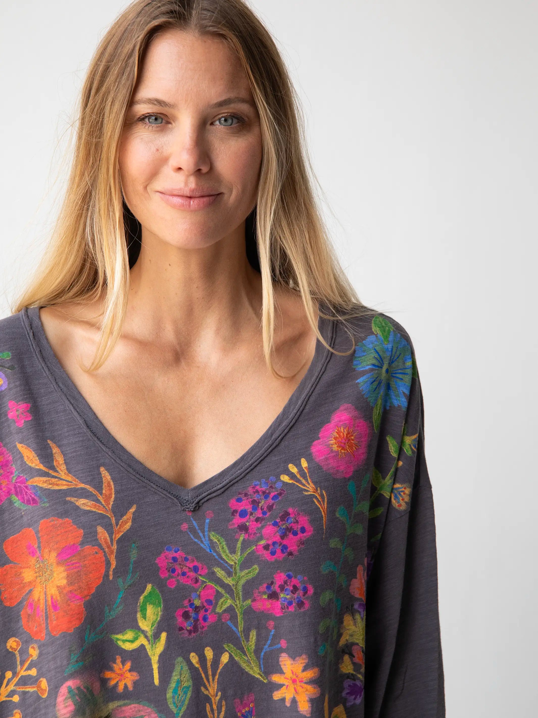 One Size Cotton Long Sleeve Easy V-Neck Tee - Charcoal Floral