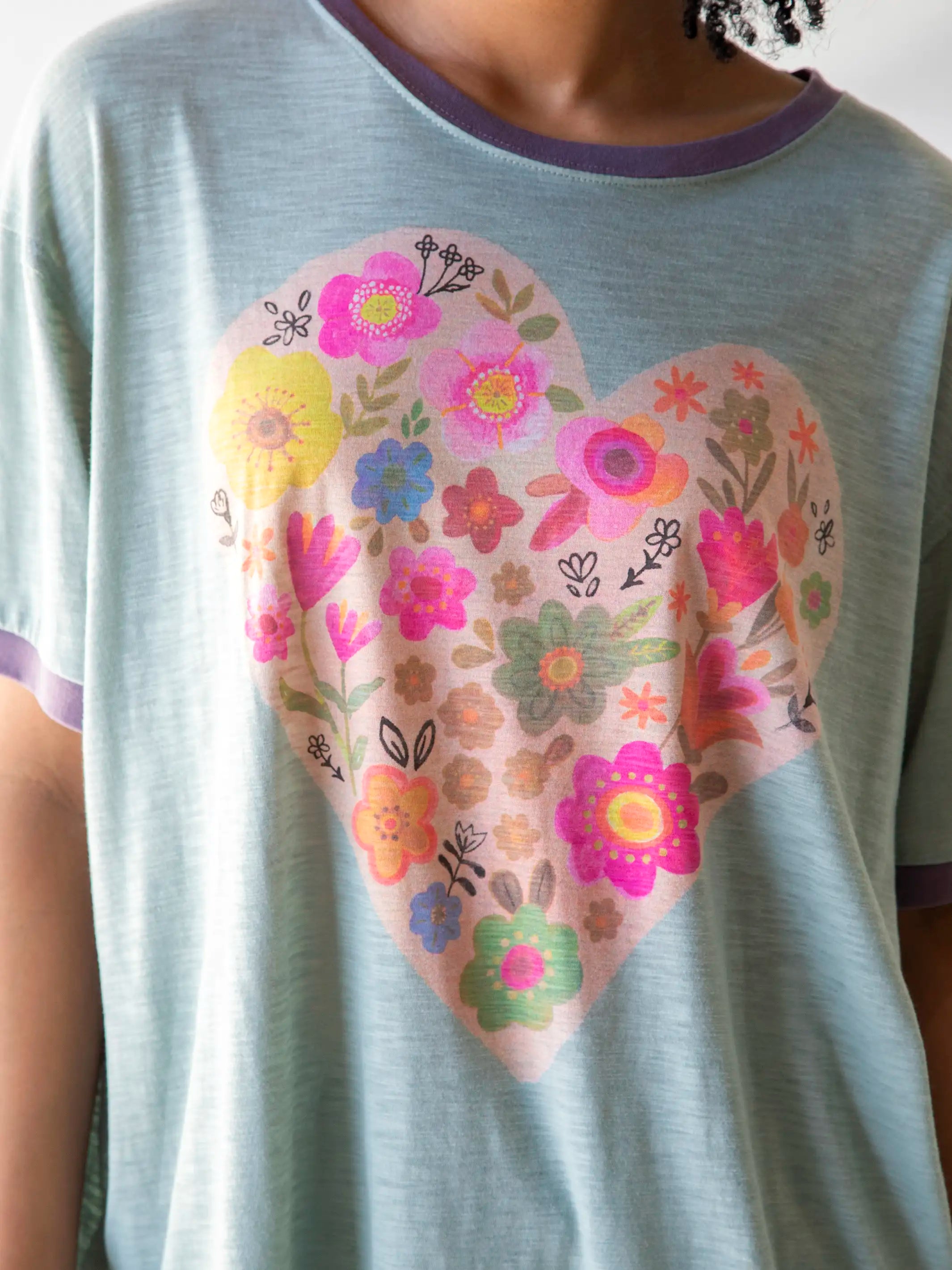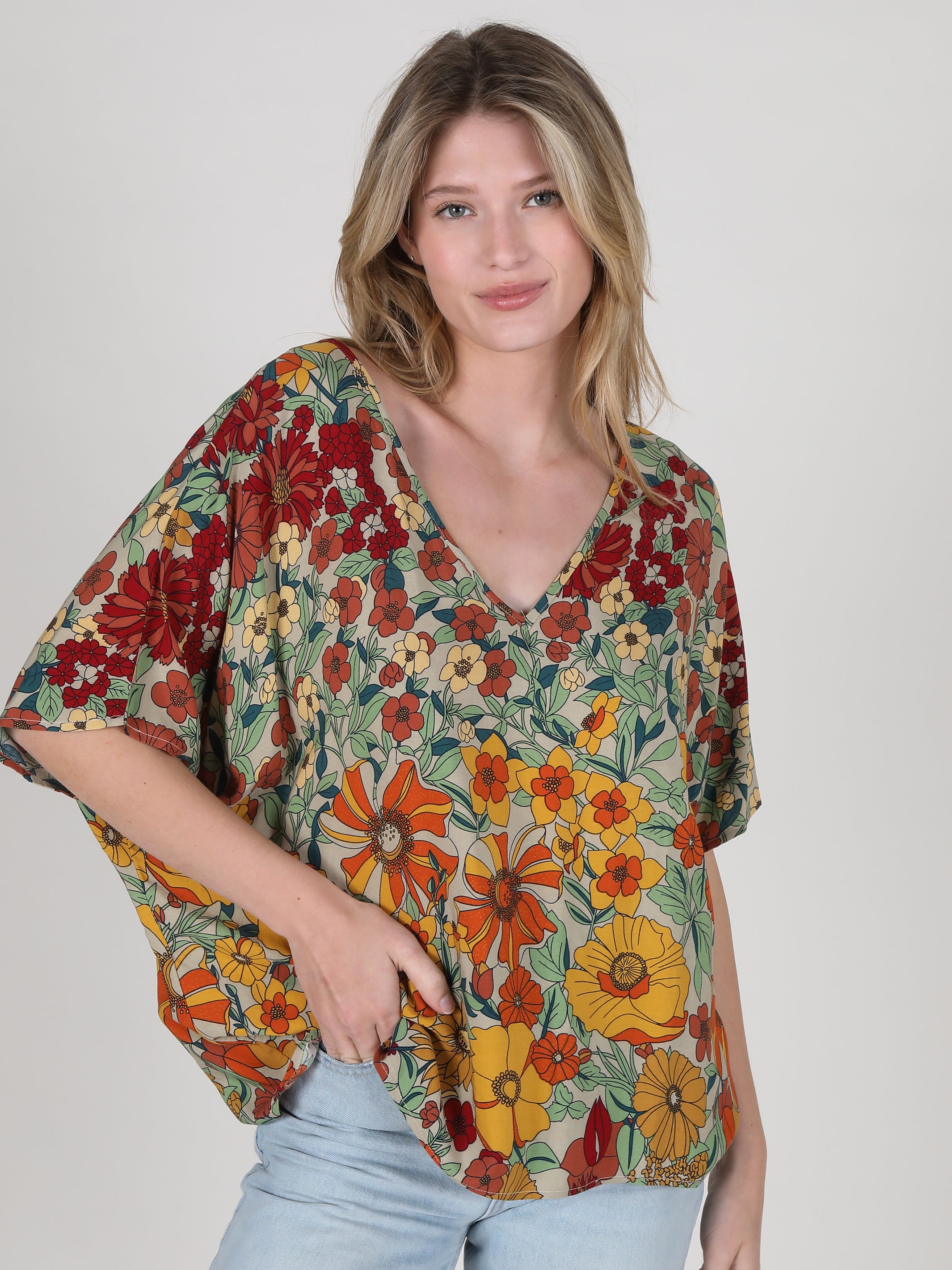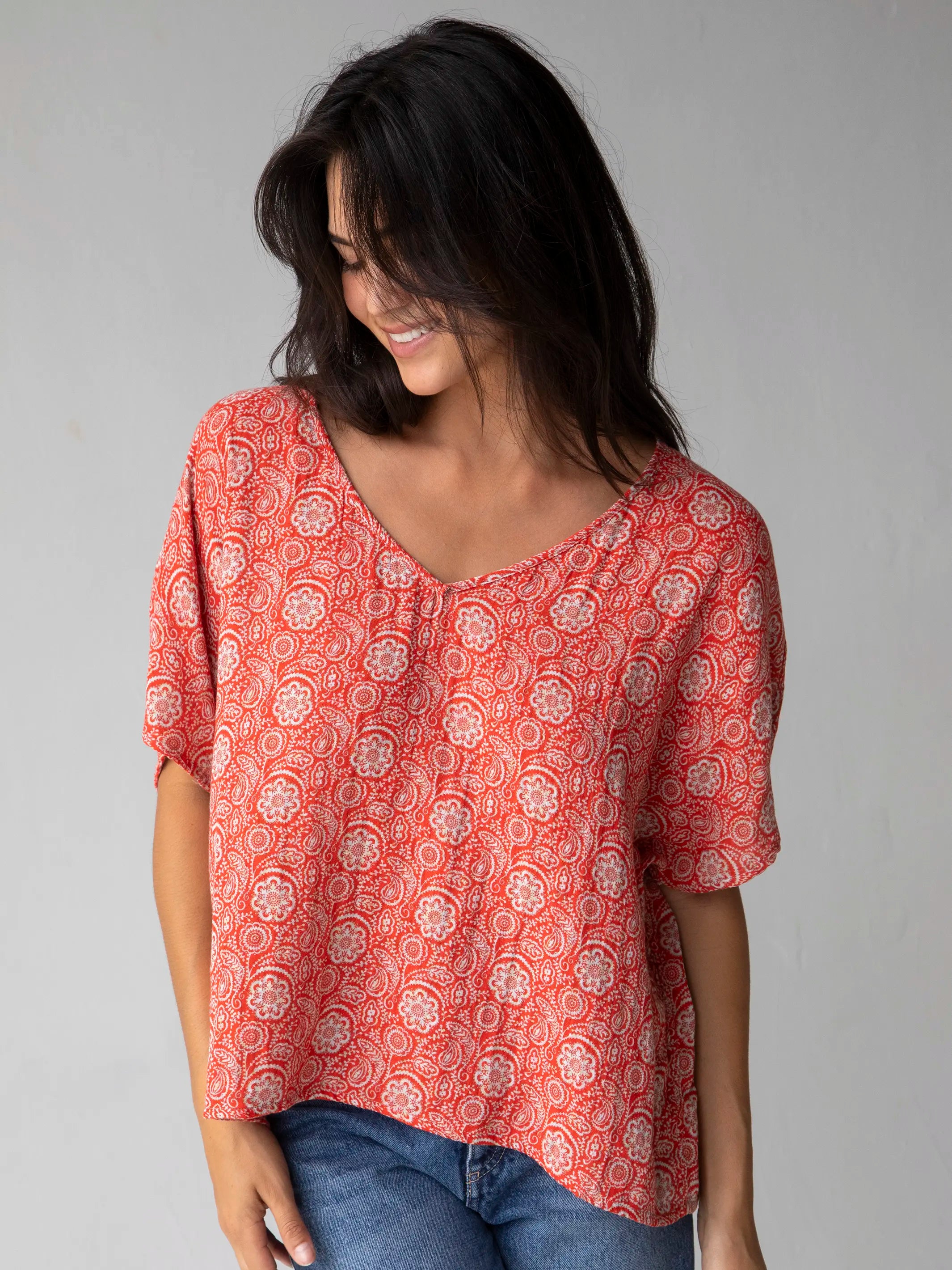 Easy V-Neck Top - Dark Turquoise Cream Rose